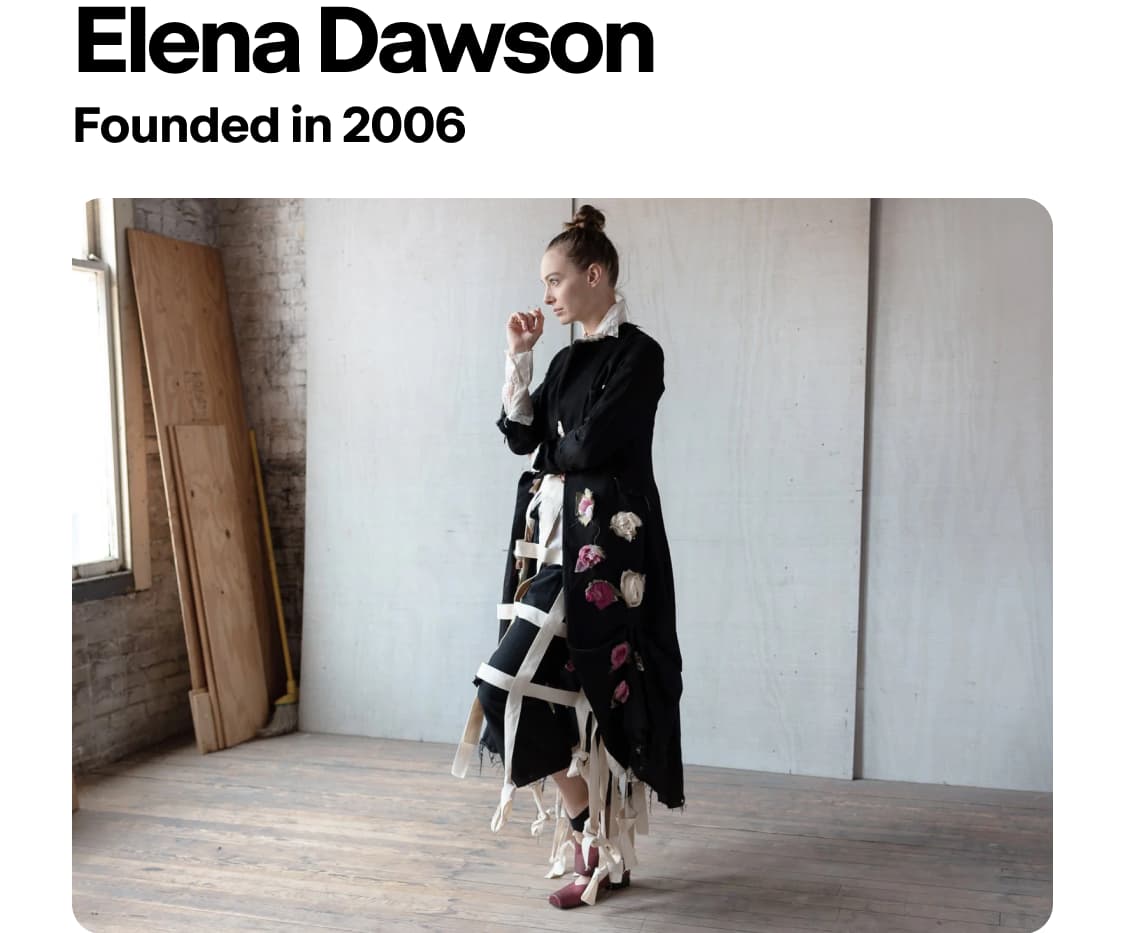 폴 한든의 핵심 파트너로 활약하며 의류 라인을 구축했던 엘레나 도슨(Elena Dawson)은 2006년 자신만의 미학적 세계를 완성하기 위해 독립했다. 그녀의 작업실은 14세기 건축물 안에 자리 잡고 있으며 그곳에서 그녀는 시간을 거스르는 ‘유령 같은’ 의복을 빚어낸다. 도슨의 옷은 빅토리안 시대의 낭만주의와 해체주의적 펑크가 기묘하게 공존하는 형태를띠는데, 특히 제작 공정 중간에 의도적으로 멈춰 선 듯한 ‘미완성’의 상태를 유지하는 것이 특징으로 마감되지 않은 솔기와 길게 늘어진 실밥은 옷에 기묘한 생명력과 역사성을 부여한다. 이는 어린 시절 할머니의 앤티크 재봉틀을 ‘타임머신’이라 믿었던 그녀에게 옷은 죽음과 의례, 그리고 사라져가는 것들에 대한 탐구다.