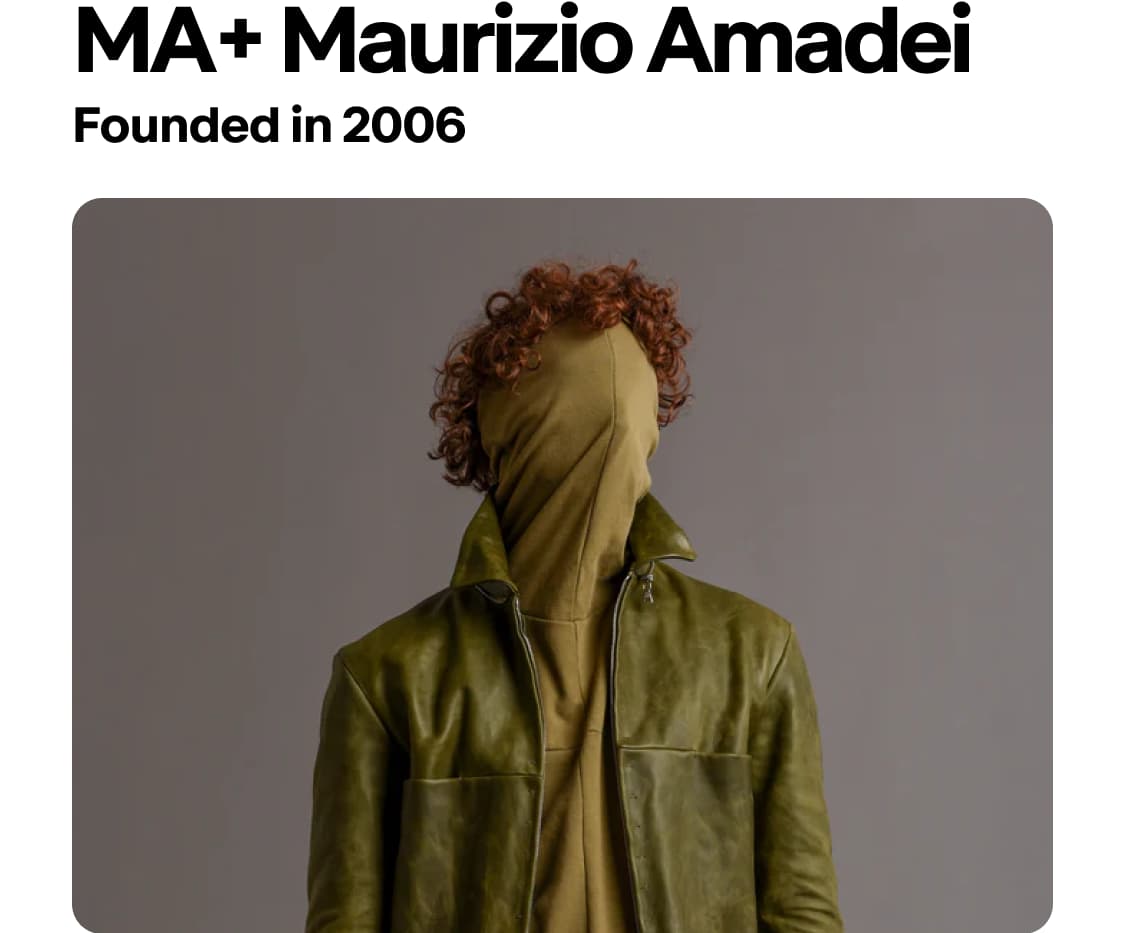 이탈리아 로마를 기반으로 활동하는 마우리치오 아마데이(Maurizio Amadei)는 정식 패션 교육을 받지 않았음에도 불구하고 자신만의 독창적인 의복 구성 방식을 정립한 아티잔 패션의 선구자다. 그의 디자인 철학은 ‘SKINS’라는 키워드로 요약되는데, 이는 인간의 몸을 모든 설계의 근간으로 삼는다는 의미를 담고 있다. 특히 그는 기존 유럽식 패턴 제작의 틀을 깨고 절개와 솔기를 최소화하는 ‘원피스(One-Piece)’ 프로젝트를 통해 업계에 거대한 충격을 안겼다. 한 장의 천이나 가죽을 복잡하게 재단하는 대신 입체적으로 접고 몰딩하여 몸을 감싸는 그의 방식은 의복이라기보다 ‘입는 조각’에 가깝다. 모든 제품은 로마에 위치한 그의 아틀리에에서 숙련된 팀원들의 손을 거쳐 소량 생산되며 원단이 겹쳐지며 자연스럽게 형성되는 시그니처 ‘+’ 모양의 교차점은 장인 정신과 미니멀리즘의 정수를 상징한다. 화려한 장식 대신 패턴 속에 숨겨진 정교한 포켓과 이음새 없는 가죽 신발 등은 아티잔 장르가 도달할 수 있는 가장 순수한 형태적 미학을 보여준다.
