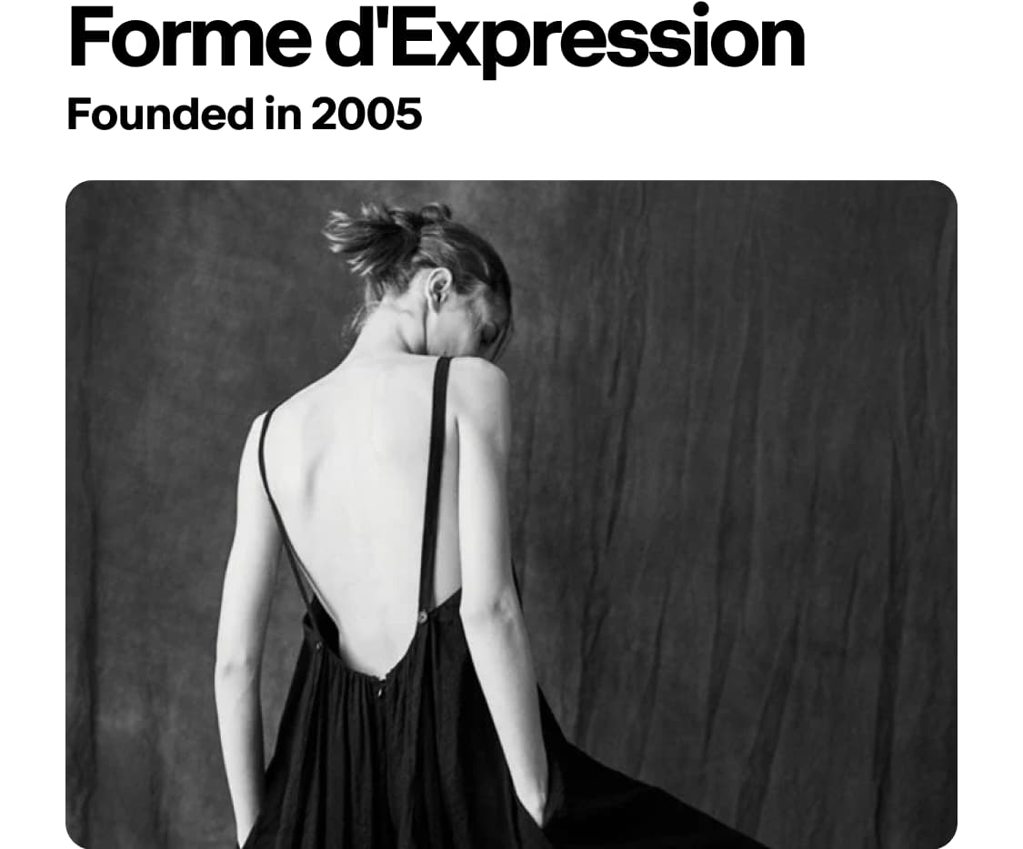 한국 출신의 디자이너 박고은이 이탈리아 페루자에서 전개하는 폼 덱스프레시옹(Forme D'expression)은 ‘침묵의 미학’을 대변하는 브랜드다. 도나 카란(Donna Karan)의 메인 라인 디자이너를 거치며 거대 패션 하우스의 정치적, 상업적 시스템에 회의를 느낀 그녀는 자신의 창의적 무결성을 지키기 위해 ‘Factory of Faith’라는 회사를 세우고 독립했다. 그녀의 작업은 화려한 로고나 자극적인 디자인 대신 옷 본연의 구조와 소재의 질감을 통해 나직하지만 힘 있는 목소리를 낸다. 하루의 80%를 패턴 제작에 몰두할 만큼 정교한 설계에 집착하는 박고은은 이탈리아, 영국, 독일의 전통 패턴 공법을 끊임없이 연구하며 생산자와의 긴밀한 소통을 위해 공방 근처로 거처를 옮길 만큼 완벽주의적인 태도를 고수한다.