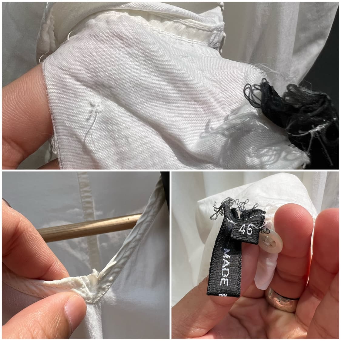 📺 - Carol Christian Poell Pullover Shirt - 실험적이고 아방가르드한 디자인과 독특한 소재를 활용한 특유의 테일러링으로 밀도 높은 매니아층을 형성하고 있는 CCP의 풀오버 셔츠입니다. - CCP답게 착용시에 바디와 슬리브를 감는 맛이 참 좋습니다. - 구매한지 10년도 넘은 제품이라 정확한 연식은 기억이 안나지만 02년도 S/S 제품으로 알고있습니다. 케어 라벨 폰트는 날아간 상태이며 사이즈와 생산지 라벨이 떨어졌었는데 어린 나이에 분실하지않으려고 뭣도 모르고 케어라벨에 붙여놨던 기억이 있네요. 풀오버 셔츠 고질병인 넥 중심 봉제가 살짝 풀렸는데 이건 그냥 한번 박으면 되고 눈에 안띄는 미세한 이염이 두군데 정도 존재합니다. 전체적으로 양호한 컨디션입니다. (스페어 버튼 두개 있음) - (Made in Italy,46) 가슴 53.5 총장 78 어깨 48 소매 64.5 (cm) - 빈티지, 세컨핸드 제품 특성 상 교환, 환불이 불가하며 미처 발견못한 오염이 있을수도 있으니 민감하신 분들은 신중하게 고민 후 구매 진행 부탁드립니다. #carolchristianpoell #캐롤크리스찬포엘 #캐롤크리스챤포엘 #아방가르드 #아티잔 #다크웨어 #ccp #obscur #옵스커 #보리스비잔사베리 #구이디