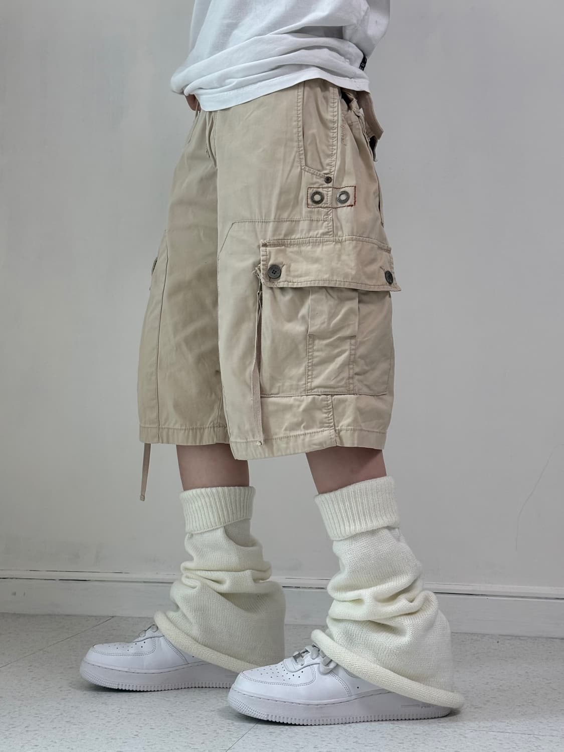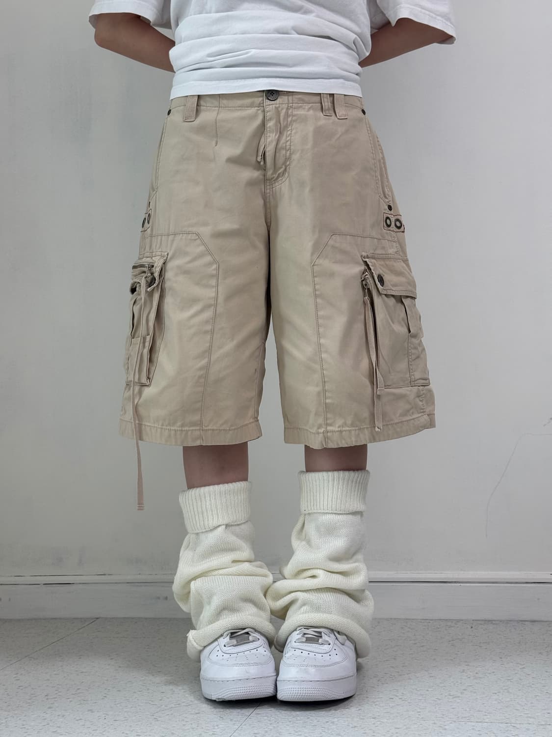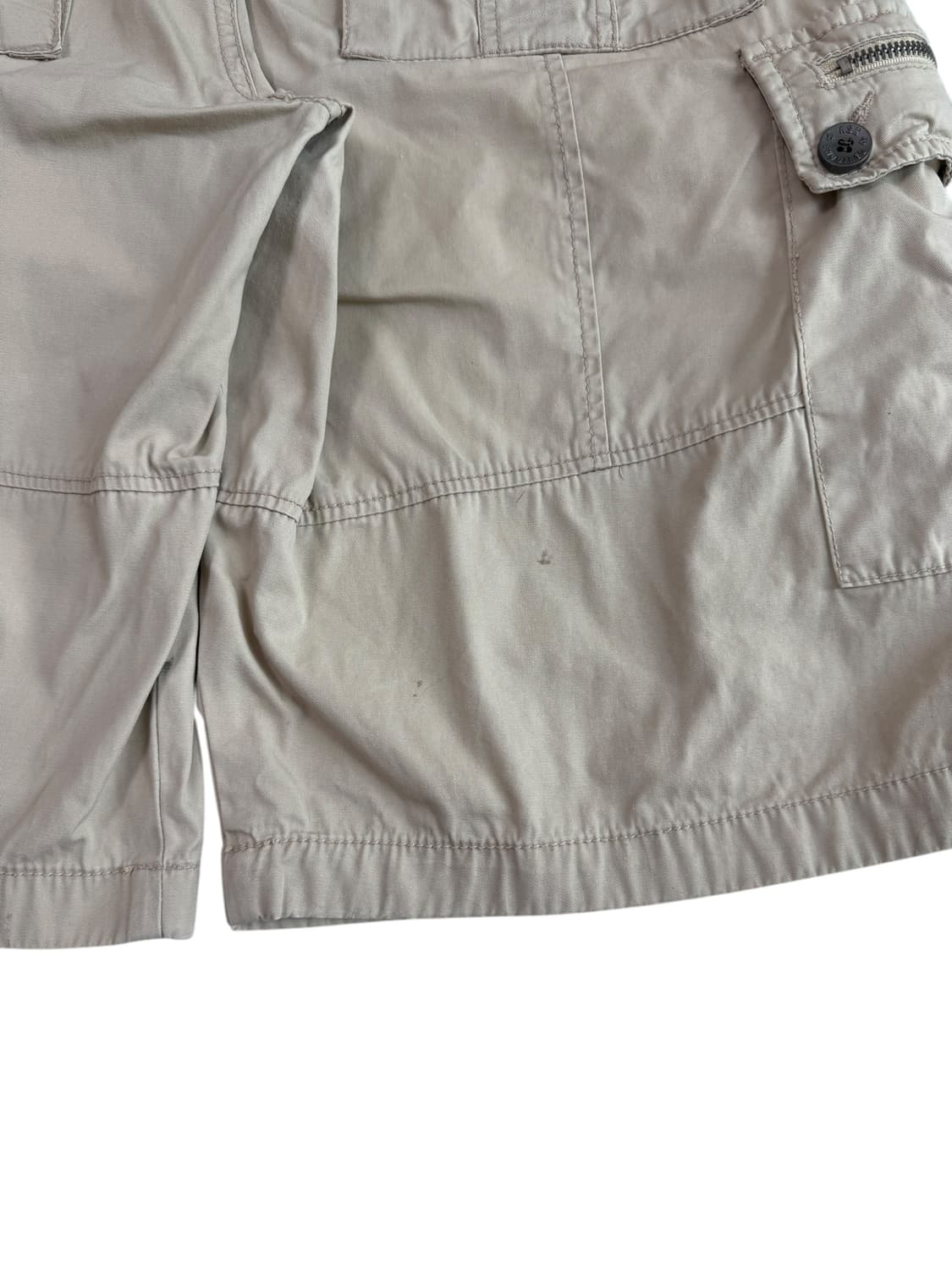 허리단면/밑위/허벅지/밑단/총장 •size 44/31/35/31/57 •condition B •빈티지 무드 가득-! 에스크 베이지 카고반바지에요ㅎ.ㅎ 사이드 스트랩+지퍼 디테일까지, 흔하지 않아서 더 좋은 팬츠 랍니다<3