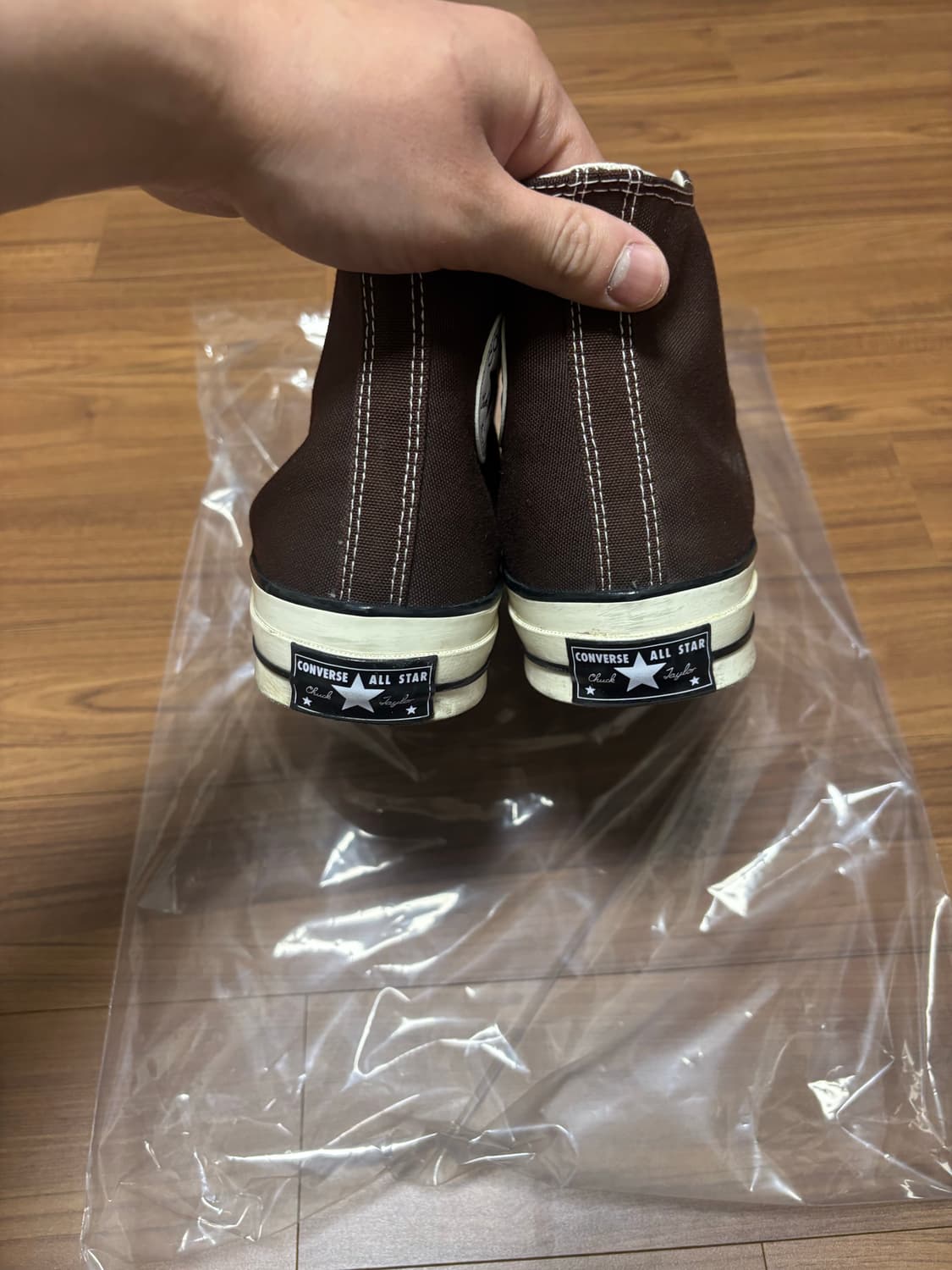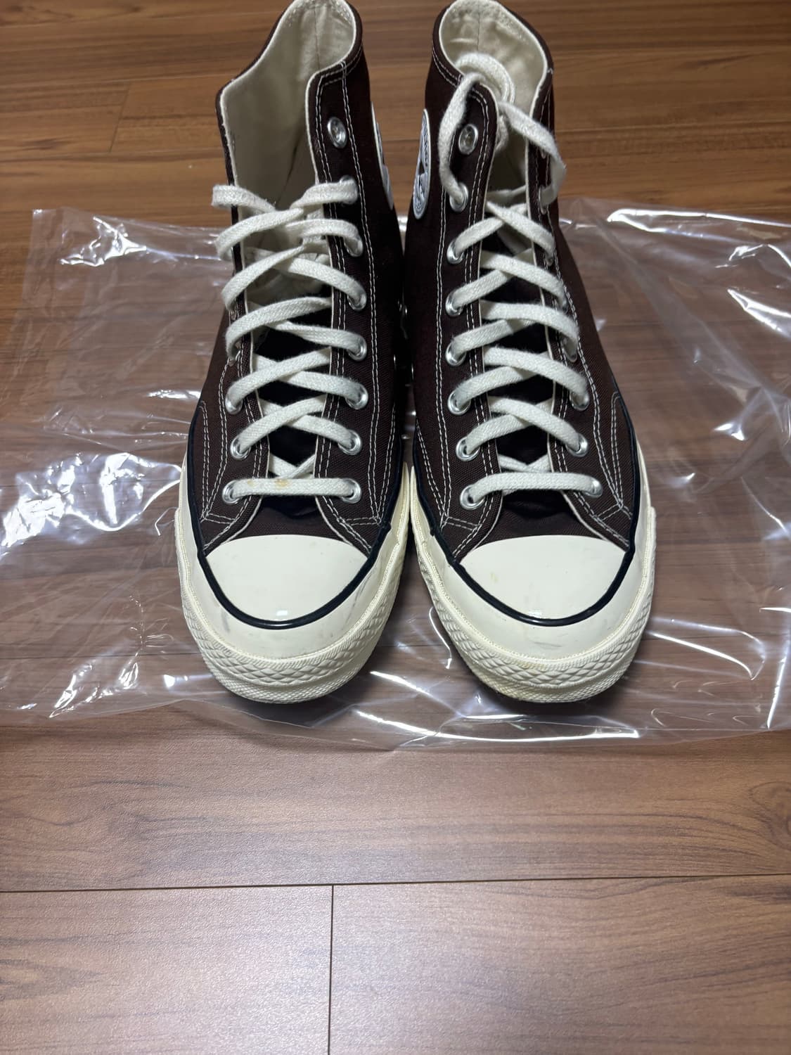 컨버스 HI 다크루트 팝니다 사이즈는 265사리즈이고 3번정도 실착했습니다 끈이랑 앞코 쪽에 살짝 오염 있고 다른부분에는 오염이 없습니다