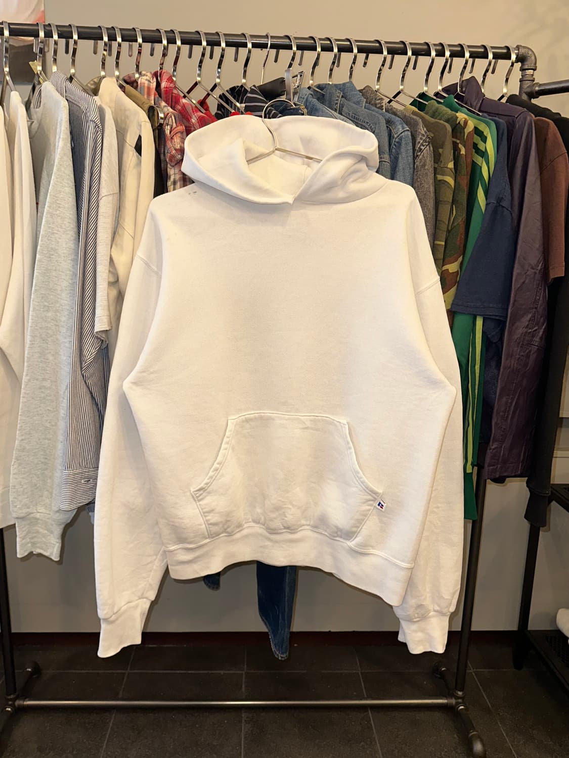 90’s Russell Atheletic Mexico white hood sweatshirt 아메리칸 대표격 브랜드, Russell Athletic사의 90년대 제작 빈티지한 감이 좋은 후드집업입니다. Russell이란 브랜드는 1902년 미국에서 시작되어 세계 최초의 스웨트셔츠를 제작한 브랜드입니다. 긴 역사만큼 방대한 유산과 기술력을 가진 러셀은 미국의 스포츠 유니폼을 시작으로 2차 세계대전의 미군의 운동복을 지나, 현재는 세계 각지의 대중들에게 트렌디한 디자인과 좋은 소재의 편안한 옷을 소개하고 있습니다. 2002년에 100주년을 맞이한 러셀 애슬레틱은 오랜 역사와 브랜드의 유산에 대한 자부심을 가지고 혁신과 다양성, 최고의 품질을 추구하는 가치를 지켜나가고 있답니다. 그렇기에 미국을 대표하는 스웻이라고 설명드리고 싶네요. 한동안 칸예 웨스트가 90년대 러셀을 착용하면서 그 수요가 말도 안되게 급증하던 시즌이 있었습니다. 90년대의 후드의 흰색이라 조금 더 레어한 녀석입니다. 적당선의 러프한 맛으로 착용하기 좋기도 한 녀석이며, 넥 라인의 약간의 뜯어짐이 이 녀석을 더욱 빈티지한 감도로 만들어 주는 것 같네요. 사이즈가 허용되시는 분들께 권해드린답니다! Made in Mexico - 총장 64-5 어깨 63 가슴 63 소매 62 - Size: M (표기, 실측기준 L) - Price: 6.0 - • 빈티지 특성상 약간의 오염이 있을 수 있습니다. • 교환, 환불이 어려워 신중한 구매부탁드립니다. • 약간의 사이즈 오차(1,2cm)가 있을 수 있습니다. - Contact DM Discount ALSO
