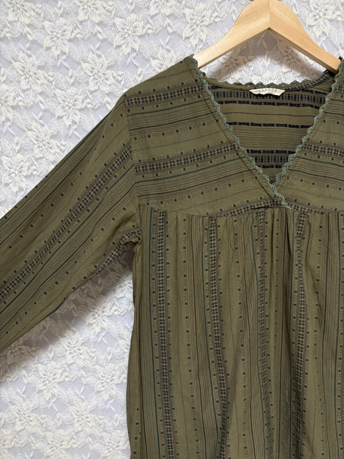 문의없이 바로 구매가능 계좌거래 천원 할인 (그외네고불가) 𝘀𝗶𝘇𝗲 총장 66 가슴단면 49 어깨 40 소매 59 암홀 21 -특별한 이염 하자 없음 -면100 -비침 없음 -카키 색상의 긴소매 블라우스 -실제 색상은 마지막 사진과 가장 흡사 model 161cm/55size