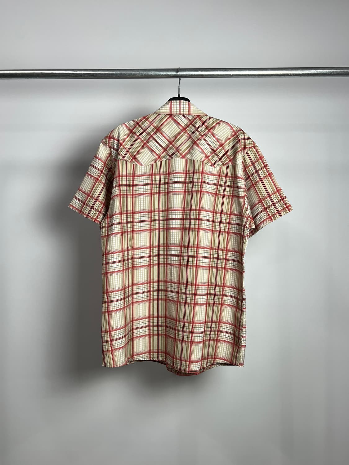 10856 어깨48 가슴56 팔22 총장73.5(cm) 웨스턴 체크 반팔 셔츠 입니다. 폴리 소재이며 앞면 작은 미세 데미지 존재. 사이즈는 실측을 참고해 주세요!