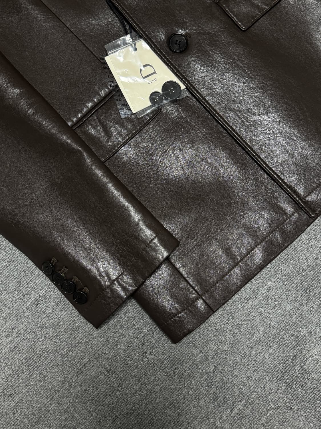 •브랜드 던스트 •상품명 유니섹스 2버튼 비건 레더 블레이저 브라운 UNISEX 2 BUTTON VEGAN LEATHER BLAZER BROWN •사이즈 M •상태 택 달린 새상품입니다. 가죽이다 보니 보관하면서 생긴 주름 정도만 있습니다. 다크 브라운 컬러가 매력적인 블레이저입니다. 소매 리얼버튼, 센터 벤트, 소뿔 단추 등 만듦새가 좋은 제품입니다. 저렴하게 판매하니 구매하실 분만 연락주세요!