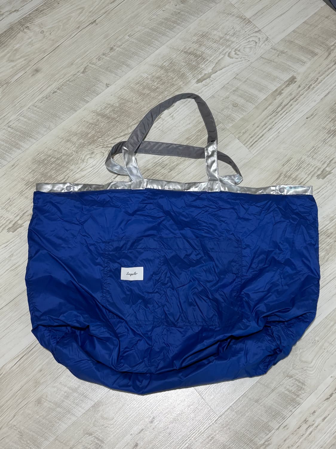 이레귤러 스튜디오 FW 24 메가메탈 토트백 가볍고 넉넉한 사이즈라 여행이나 짐 많을 때 좋아요. 실버 쪽은 약간 광택감 있는 소재고, 블루 쪽은 무광 나일론 느낌이에요. 사이즈는 사진에 생수병과 비교해 참고해주세요. 유연한 네고 가능합니다 편하게 연락주세여
