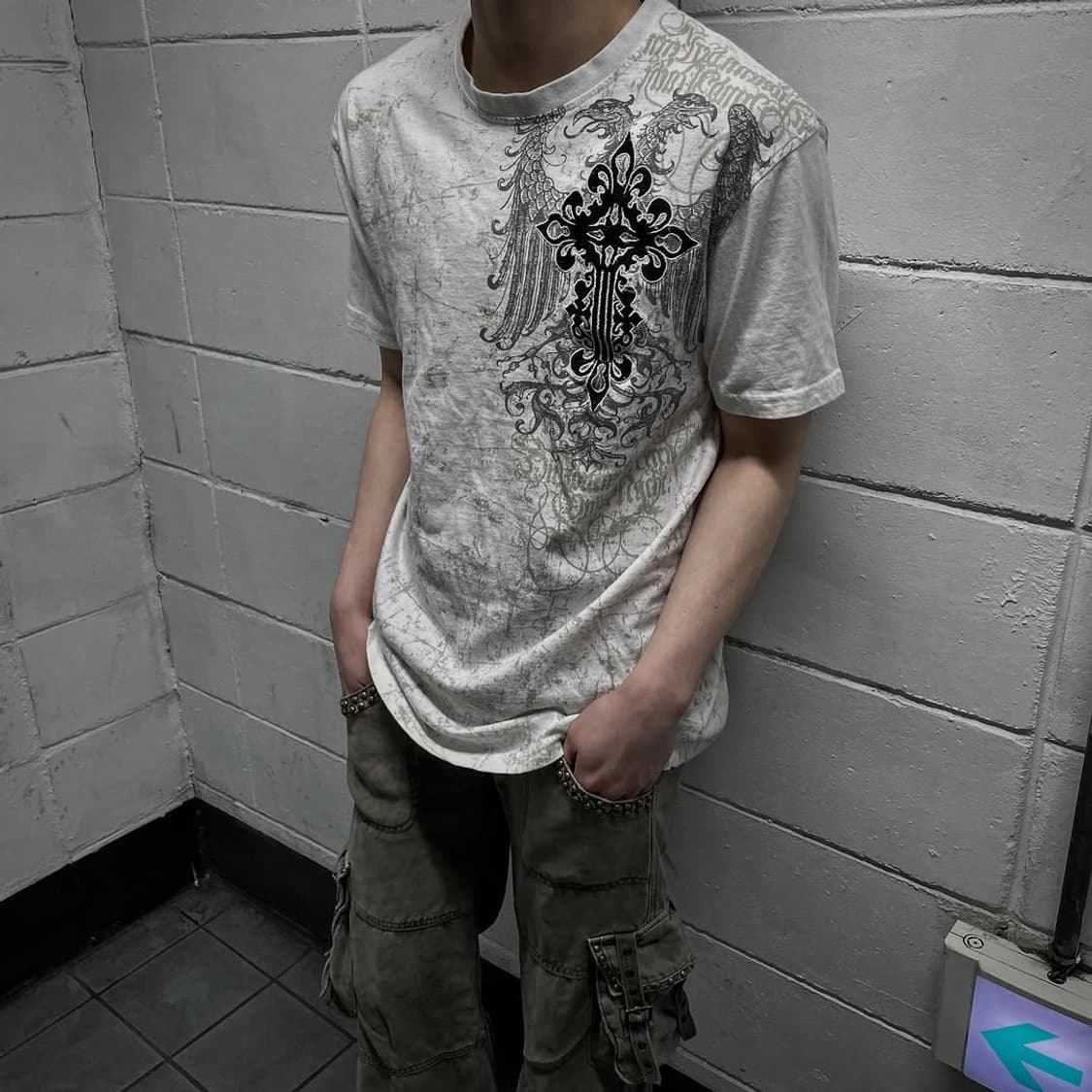 “ gothic religion cross printing half sleeve “ . . . . Price : 4.5 Size 어깨 49 가슴 52 총기장 69 . . . . . . *condition 8/10* ✚ 빈티지 특성상 교환 , 반품이 어려우니 신중한 구매 부탁드립니다! ✚
