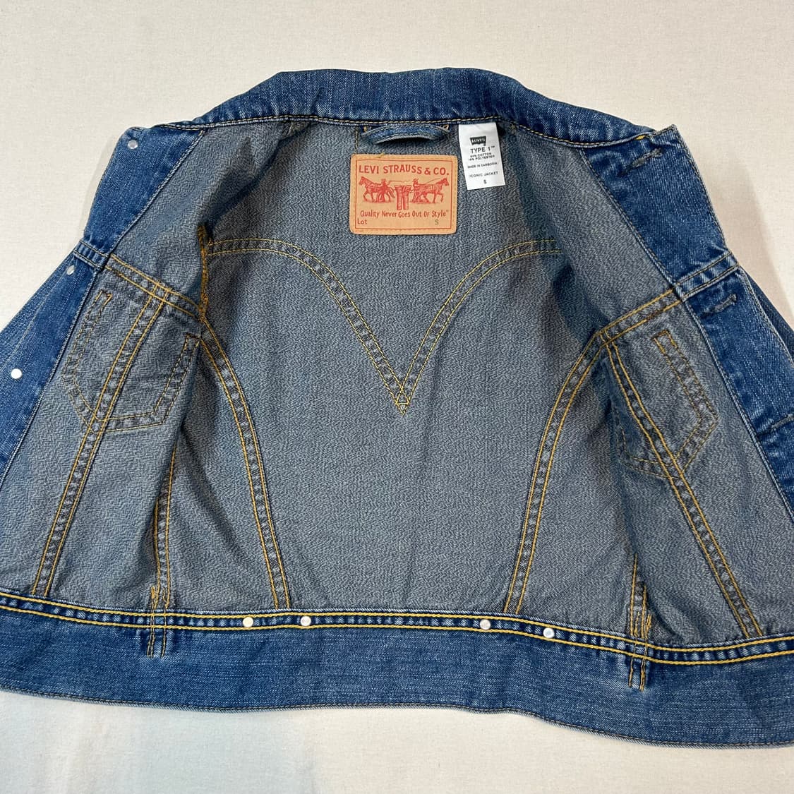 인기 데님웨어 브랜드 리바이스 사의 진한 컬러감과 대비되는 굵은 스티칭이 특징인 아이코닉 TYPE 1 청 데님 자켓 입니다. 별다른 오염이나 손상 없는 좋은 컨디션 입니다 😊 사이즈 S 어깨 41 가슴 44 총장 49 팔 62 컨디션 9/10 . . —————————————— ❗️두 제품 이상 구매시 무료배송 ❗️ ❗️단순 변심으로 인한 교환 및 환불이 불가합니다. ❗️실사이즈가 표기와 다를 수 있음으로 실측 확인 꼭 부탁 드립니다. ❗️보시는 제품은 중고 입니다. 예민하신분은 새 제품을 구매하시는걸 권장 드립니다.