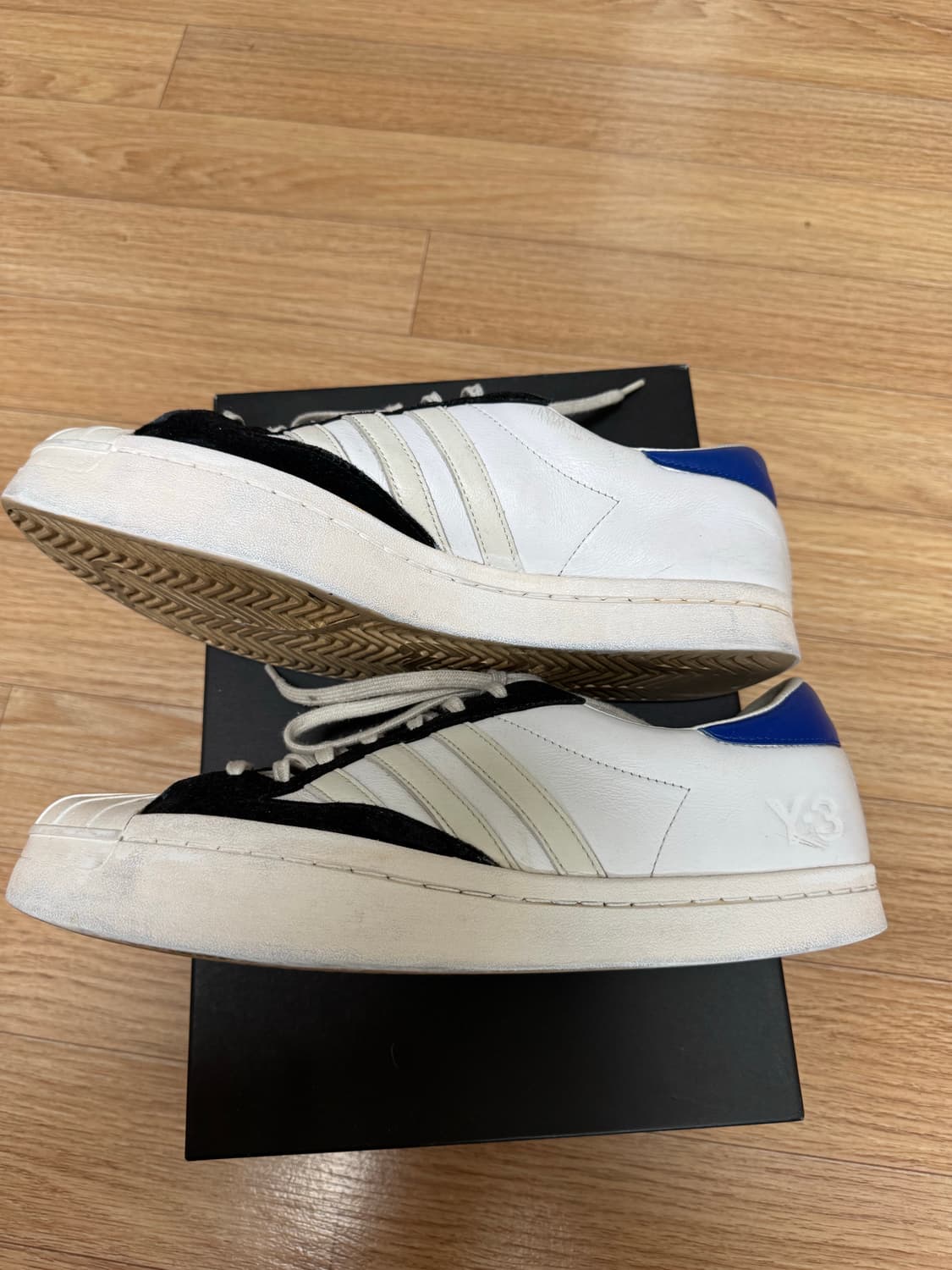 Y-3 요지 스타 클라우드 화이트 볼드 블루 판매합니다. 새제품 구매해서 5번 정도 신었습니다. 사진에서 보시듯 큰 이상없이 상태 깨끗합니다. 중창이랑 앞코부분이 원래 살짝 누렇게 나온 제품인데, 제품 특성상 황변이 심해져 백화제로 다시 염색해놓았습니다. 시간 지나면 다시 천천히 익어가요. 박스포함 구성품 모두 있습니다. 저렴하게 판매합니다