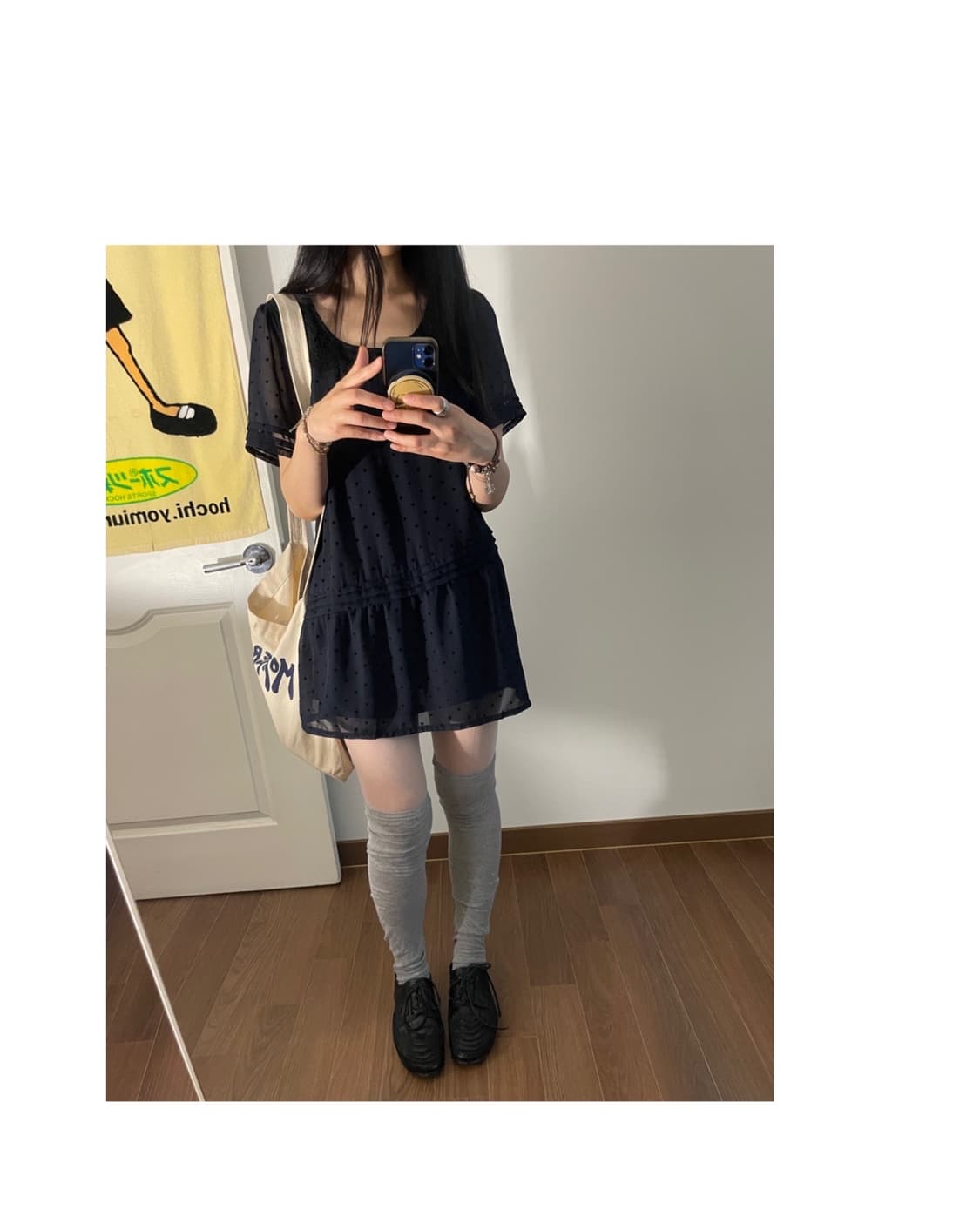 [color] deep navy [size] m [fabric] 폴리에스테르 100% [measurement] 어깨 37 팔 23 가슴 47 총장 77.5 [model size] 165 / s-m * 부드럽고 하늘하늘한 소재감 (내부 이너가 있어 몸은 비치지 않으며 소매는 비침이 있음) * 은은한 도트 패턴, 넥라인 레이스 포인트 * 밑단 비대칭 라인