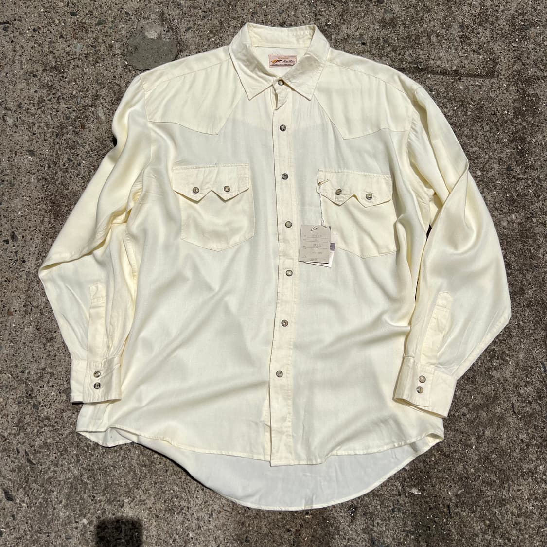 📺 - [Deadstock] Vintage Mac Hope Rayon Western Shirt - 일본 Mac Hope 에서 제작된 레이온 웨스턴 셔츠 - 레이온 100%, 특유의 실키한 터치감과 은은한 광택감이 특징입니다. - 눈에 안 띄는 얼룩이 2군데 정도, 맨윗 버튼 밴드 끝쪽 봉제가 살짝 터졌으며 소매 커프스 쪽 수선 자국 존재, B급 데드스탁이나 입으시는데에는 아무런 지장 없는 컨디션입니다. - (표기 M, 실측 XL) 가슴 63 총장 82 어깨 54 소매 60.5 (cm) - 빈티지, 세컨핸드 제품 특성 상 교환, 환불이 불가하며 미처 발견못한 오염이 있을수도 있으니 민감하신 분들은 신중하게 고민 후 구매 진행 부탁드립니다. #western #웨스턴 #웨스턴셔츠 #빈티지