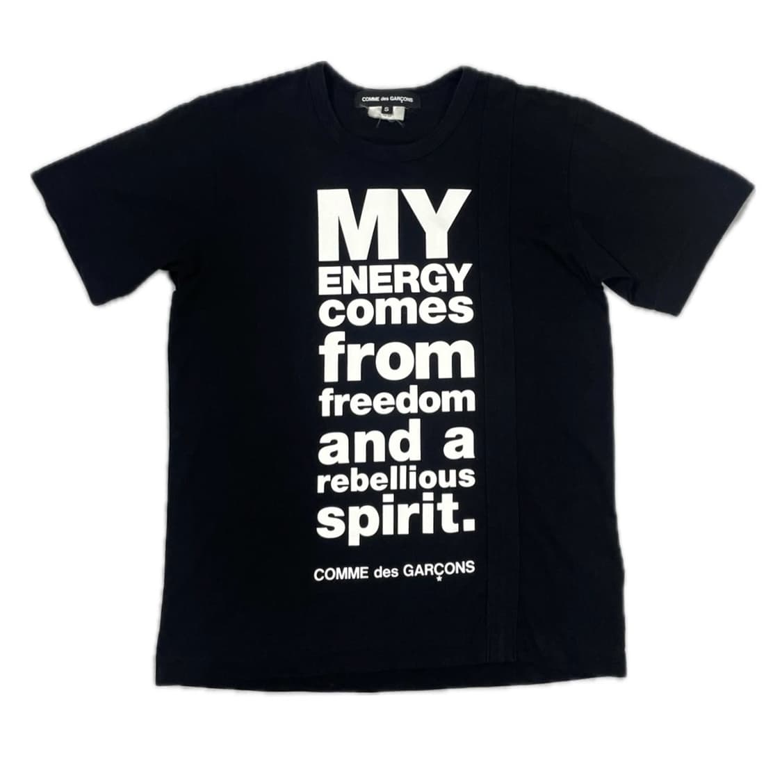 •브랜드: Comme des Garçons • 색상: 블랙 바탕에 화이트 텍스트 특징: • 전면 중앙에 MY ENERGY comes from freedom and a rebellious spirit. 텍스트 프린트 •사이즈 : M 다른 예쁜 상품들도 많이 판매 중입니다 편하게 문의주세요 감사합니다:)