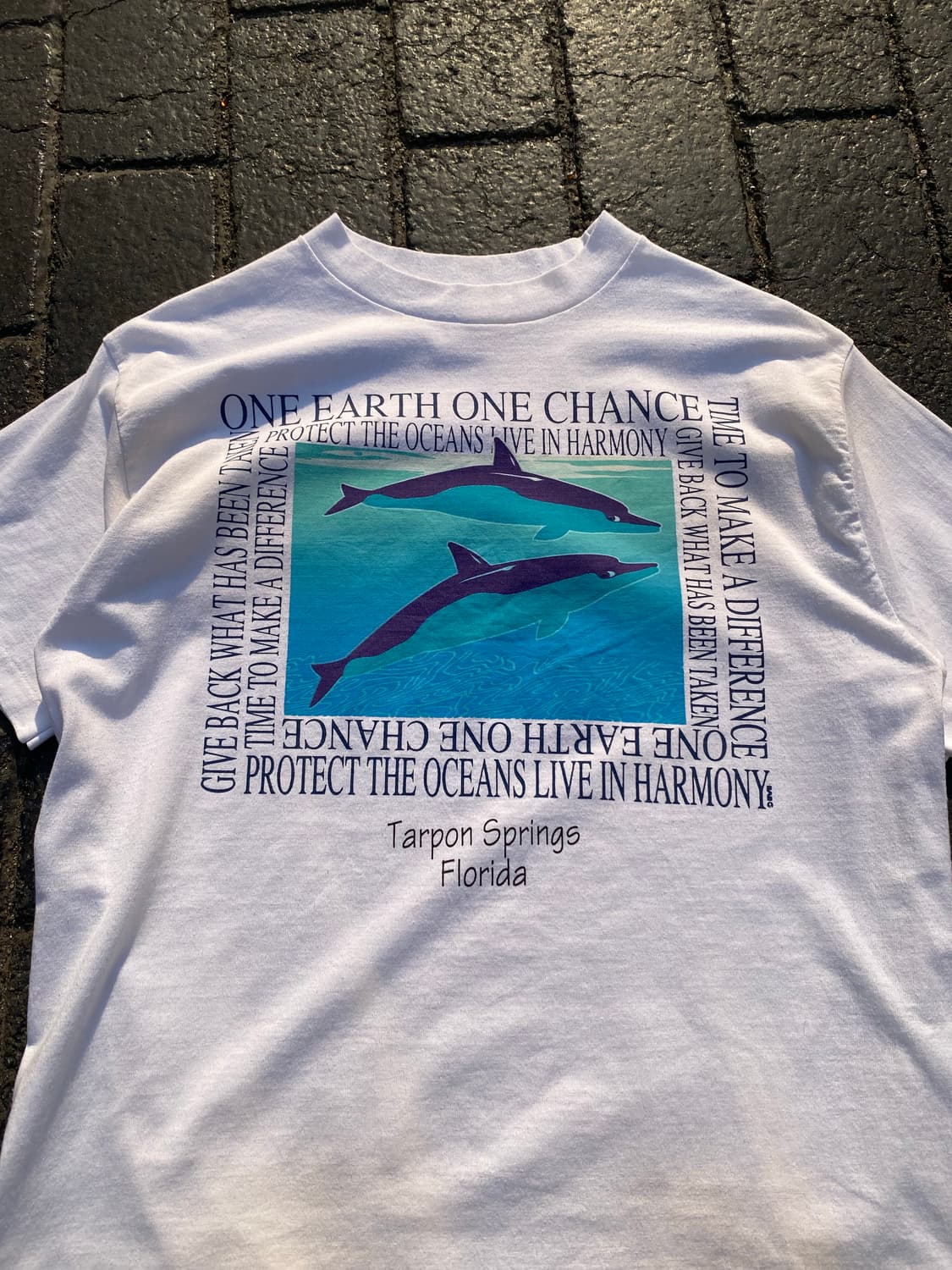 Sunshine apparel dolphin print T-shirt 미국발 Sunshine apparel of Sarasota 사의 반팔 티셔츠입니다. Sunshine Apparel of Sarasota는 미국 플로리다주 사라소타에 위치한 스포츠웨어 도매 업체입니다. 이 회사는 1990년대부터 활동을 시작하여, 주로 남성, 여성, 아동용 의류를 제조 및 도매로 공급해왔습니다. 특히 플로리다 지역의 관광 기념품 시장에서 인기를 끌었던 빈티지 스타일의 티셔츠를 제작한 것으로 알려져 있습니다. 주로 빈티지에서 보이는 브랜드이며 플로리다를 테마로 한 제품들이 많은 것이 특징입니다. 이 제품도 그런 것으로 보이며 가운데 돌고래 프린팅이 특징인 녀석입니다. 넥 시보리가 두꺼운 것이 특징이며 사이즈가 생각보다 커서 남성분들께 추천하는 제품입니다! 여름철 데님이 툭 걸치기 좋은 녀석이며 프린팅 때문에 여름과 더 잘어울리는 느낌의 제품으로 추천합니다! - 총장 72 어깨 53 가슴 58 소매 20 - Size: XL (표기) - Price: 2.8 - • 빈티지 특성상 약간의 오염이 있을 수 있습니다. • 교환, 환불이 어려워 신중한 구매부탁드립니다. • 약간의 사이즈 오차(1,2cm)가 있을 수 있습니다. - Contact DM Discount ALSO