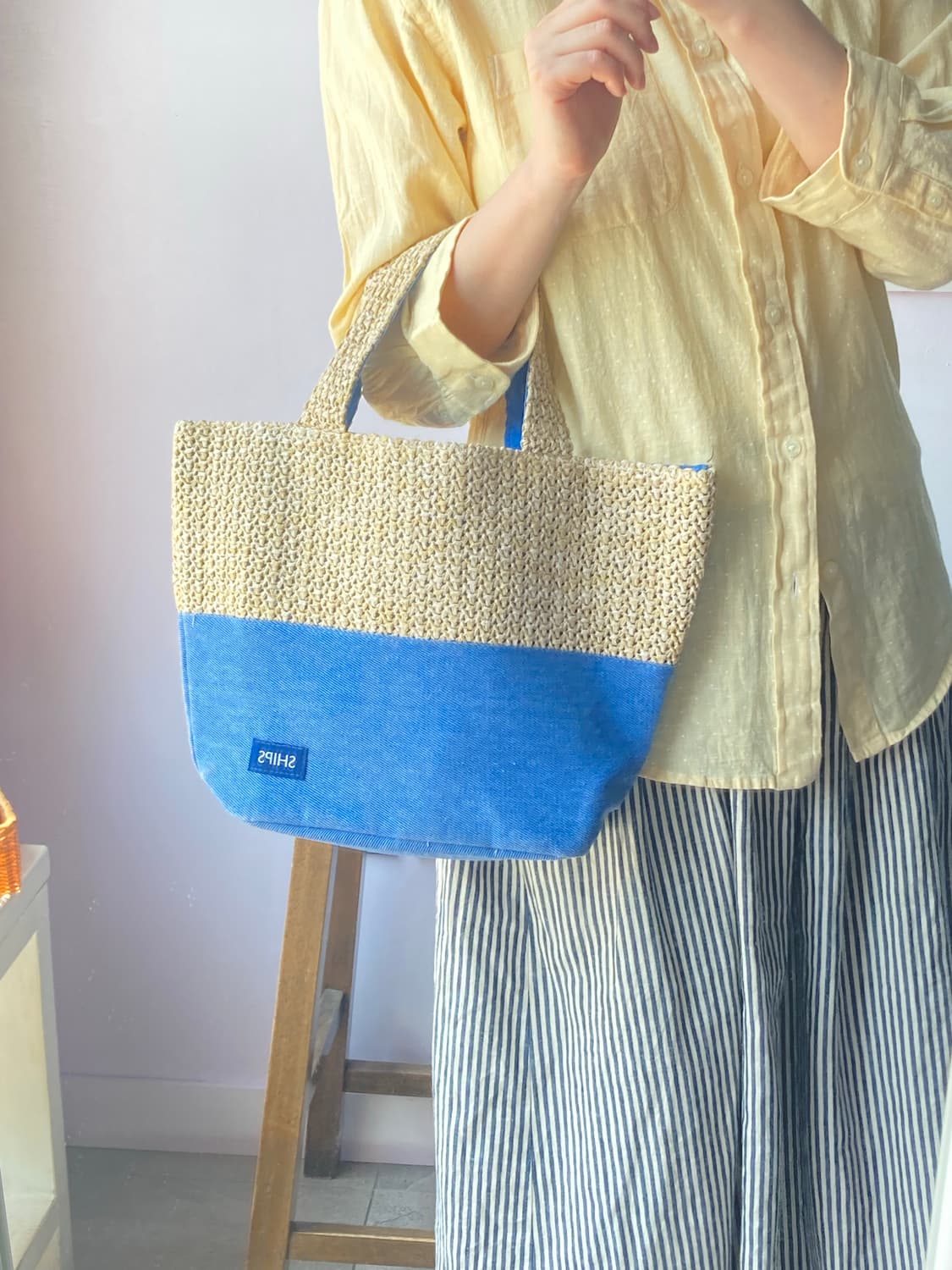 ships 2017년 6월 잡지부록으로 초여름 가방으로 나온 쉽스 토트백이에요! 깔끔하고 시원해서 지금 들면 딱이죠 . .-`૮.◜o◝ ა 아래는 데님 느낌 나는 캔버스 재질, 위에는 라탄을 모방한 짜임! 안감은 100% 방수까진 아니더라도, 어느정도 가능한 소재예요 사입할때 먼지가 묻어 있어서 . . 제대로 하자를 못봤는데🥹 뒷부분에 스크래치 난 부분이 있어요. 감안하여 저렴히 팝니다. 색감은 첫번째 사진 봐주세요 ! 세탁 완료 🏡 실측: 바닥가로30 폭8.5 높이25
