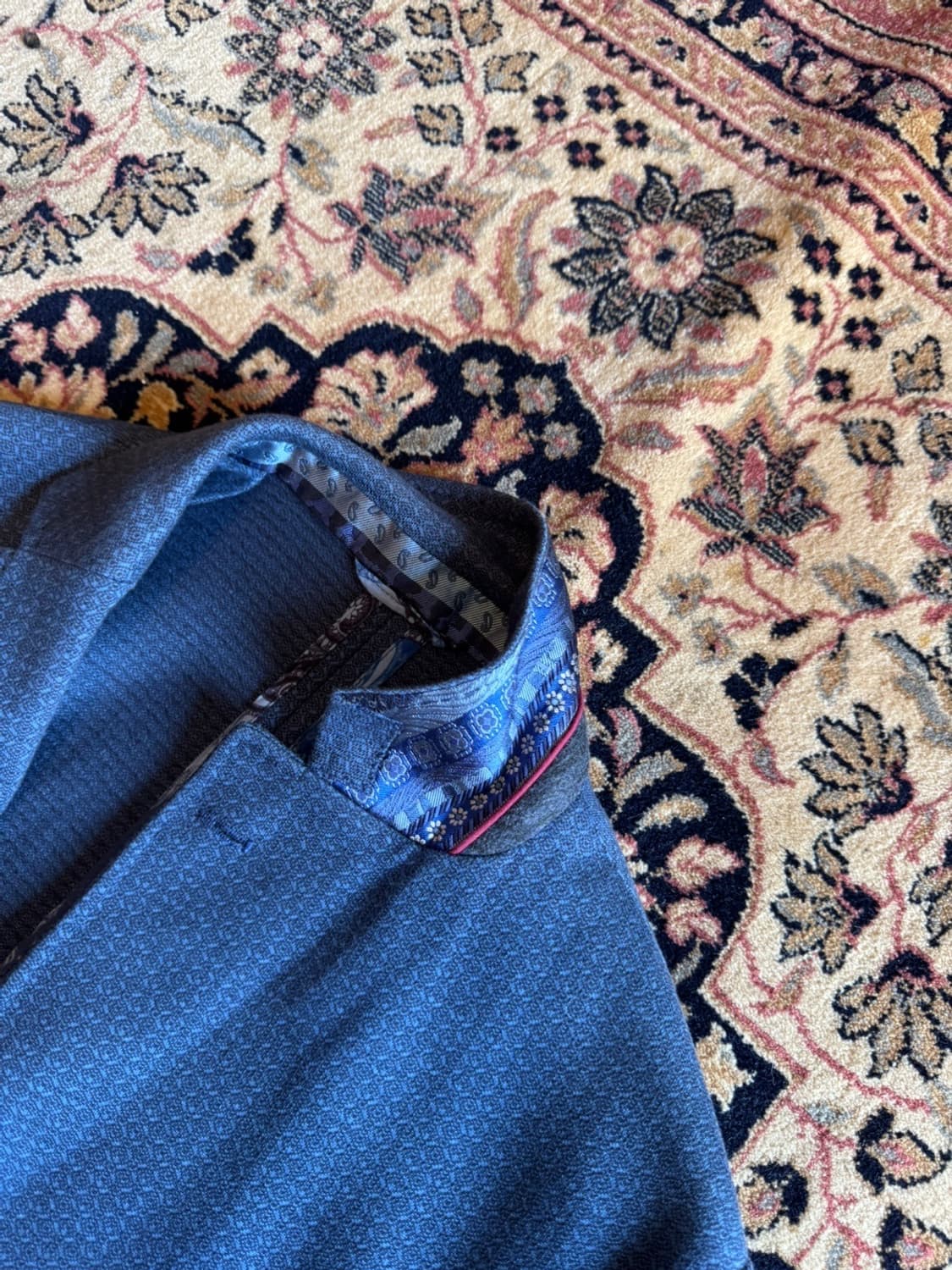 에트로가 제시하지 않았다면 세상이 노출되지 않았을 패턴만으로도 이미 충분히 기여한 그들의 스포츠코트입니다. 견고한 저지패브릭으로 여느 포멀한 테일러드자켓 이상의 고급감을 남긴 한장으로 라르디니 상급공방에서 재단된 기품 넘치는 모델입니다. 사이즈 이탈리아 48 국내 100 추천합니다. 감사합니다.