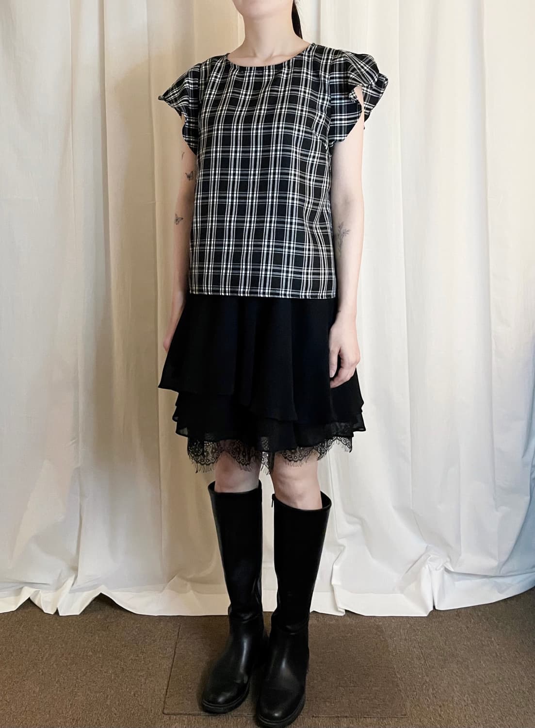 Check Ruffle Blouse - Black Made in Japan 단정한 블랙 체크 패턴에 소매 러플 디테일이 더해진 블라우스입니다. 톡톡한 원단 덕분에 형태가 예쁘게 잡혀 입었을 때 실루엣이 안정감 있게 살아납니다. 뒷목의 작은 꽃 버튼이 은은한 포인트가 되어줍니다. ⊹ Condition. 9/10 총장 56 어깨 33 소매 11 가슴 46 마호리의 모든 제품은 세탁 후 꼼꼼히 검수하여 발송됩니다.