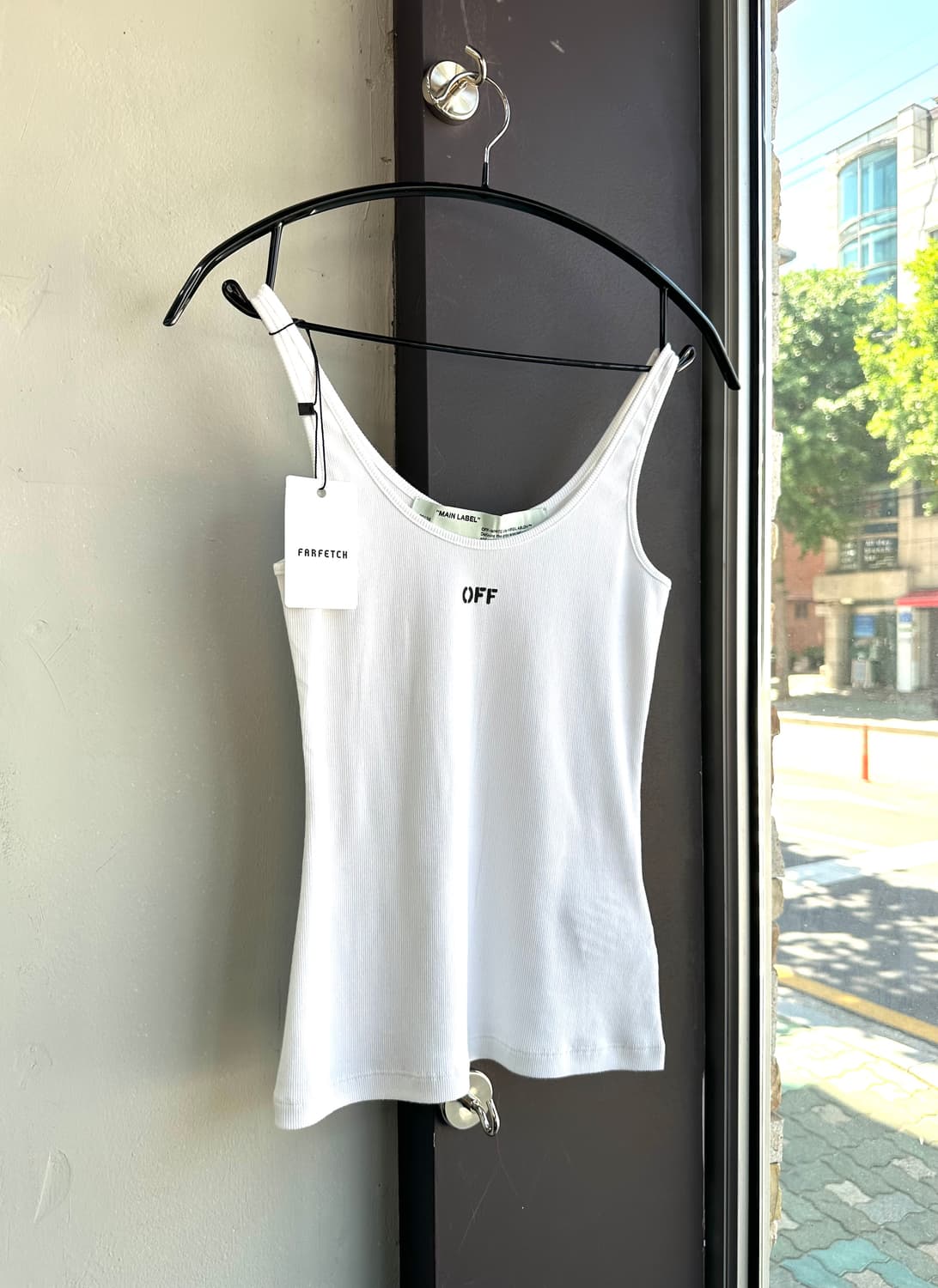 오프화이트 리브드 슬림핏 탱크탑(새상품) 사이즈 40 표 첨부 하였으니 확인 바랍니다! 정품 미니멀한 감성에 OFF 화이트 특유의 위트를 더한 슬림핏 탱크탑입니다. 상단에 자수된 ‘OFF’ 로고는 심플하면서도 확실한 포인트를 주며, 잔잔한 골지 조직과 신축성 있는 텍스처로 몸에 편안하게 감기듯 밀착됩니다. 단독 착용은 물론, 자켓이나 셔츠 안 이너로도 활용도 높은 아이템. 시즌 상관없이 데일리룩에 세련된 무드를 더해줍니다. 가품 시 보상합니다.