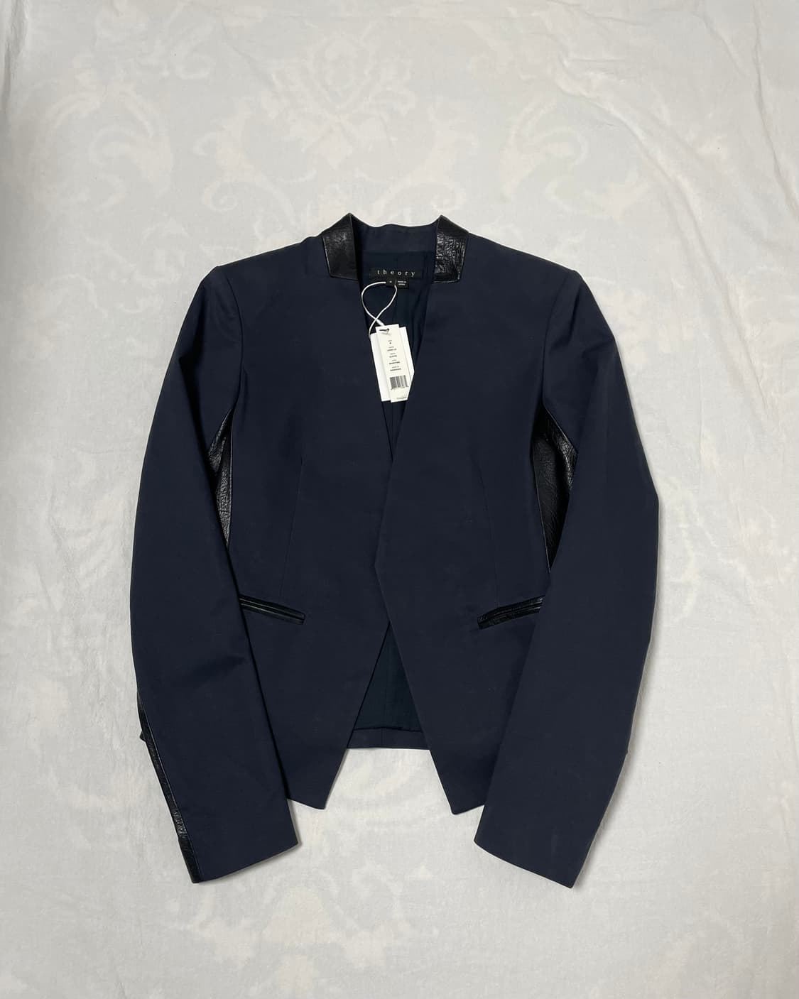 Theory Contrast Leather Panel Blazer *Price 5.0 절제된 구조 위에 날 선 디테일이 얹힌 Theory의 레더 배색 블레이저. 광택 없는 폴리-코튼 혼방 바디 위로 램스킨 가죽이 카라, 암홀, 소매 라인을 타고 내려오며, 단정함 속에 날을 세운 실루엣을 완성합니다. 뒤틀림 없는 재단과 어깨의 각은 체형과 상관없이 날렵한 무드를 부여합니다. 단독으로는 물론, 드레이프 셔츠나 하이넥과 함께 스타일링할 경우 고딕·다크웨어 룩의 균형을 잡아주는 탑 피스로 기능합니다. *Size shoulder_ 39 chest_ 43 length_ 53 (cm) *Condition 9/10 Instagram followers get 10% off