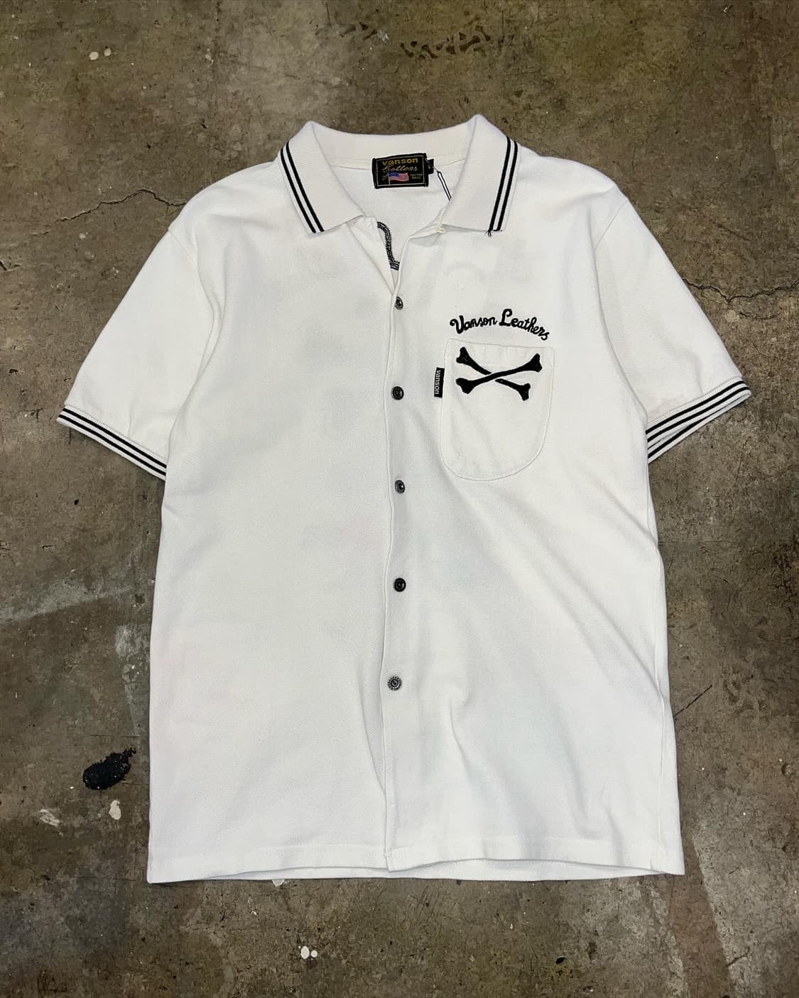 Today Product 5 #vansonleathers #밴슨 < Vanson Bone Embroidery Shirt > 🩻 밴슨 본 자수 반팔 셔츠 🩻 ¥ 빈티지 약간의 사용감 존재합니다 ( 9.0 / 10 ) ¥ 표기 사이즈 L 가슴단면 52 / 총장(카라제외) 67 cm Contact DM ! ❤️ . . .