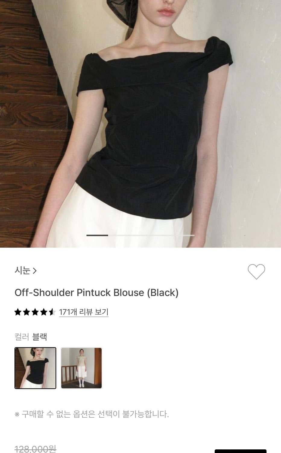 시눈 오프숄더핀턱블라우스 블랙 색상입니다 오프숄더가 아닌 어깨에 걸쳐 입을 수도 있는 디자인입니다. 택 제거된 새상품입니다