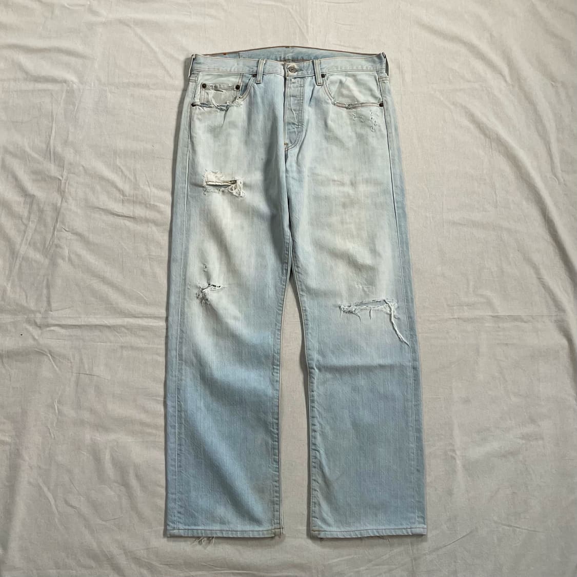 ⠀ 2000‘s Levi’s Distressed 501 Denim ⠀ ⠀ Size: 34inch(단면 43cm) 총장 102cm 밑위 31cm 허벅지 33cm 밑단 22.5cm ⠀ 75,000₩ ⠀ ————————— -문의 DM