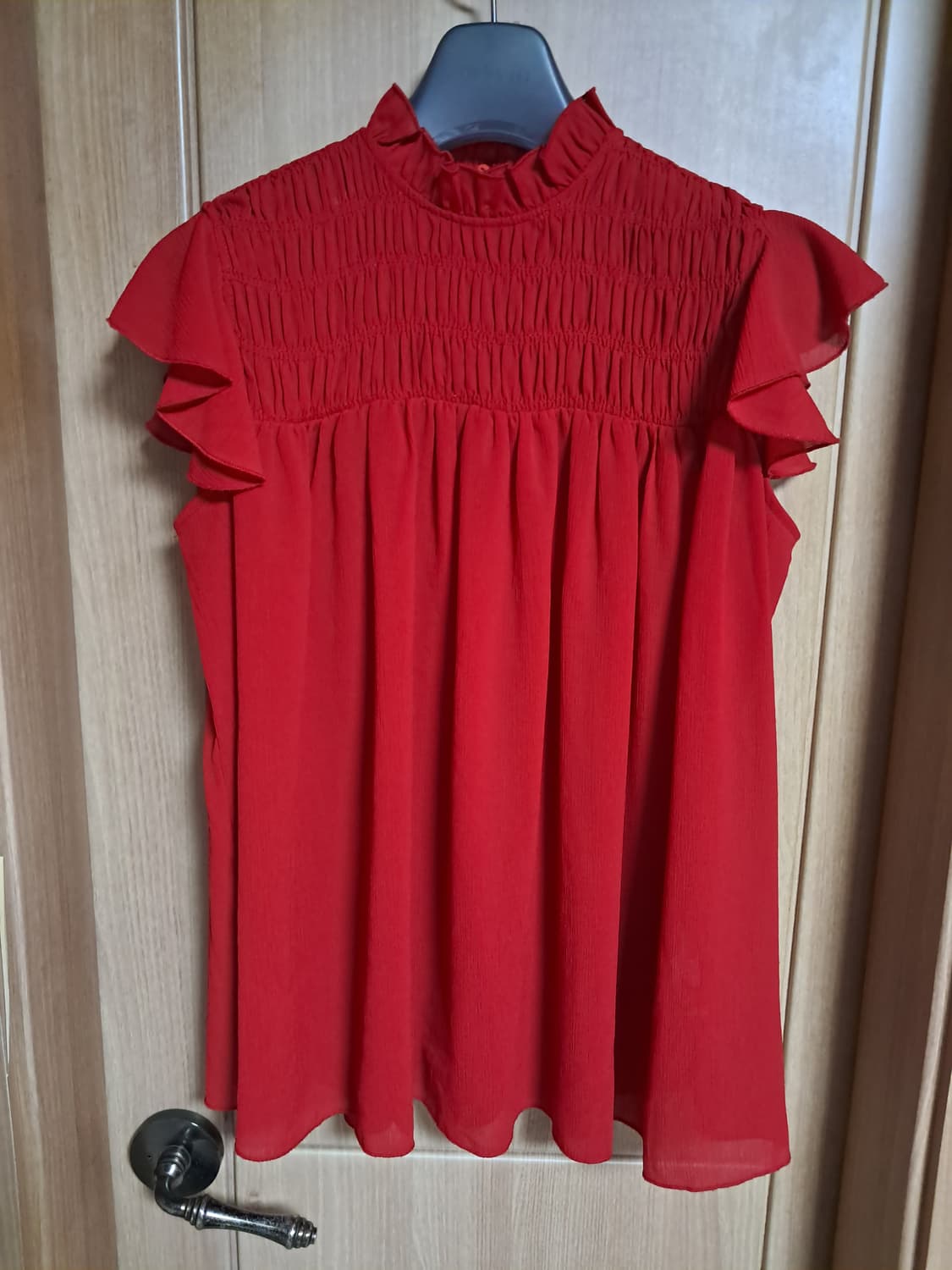 상태 깨끗합니다 사이즈S (160/80A) 가슴52 총장66 어깨34 팔8 폴리에스터 얇고 시원한 재질 까슬하고 하늘하늘한 감촉 레드