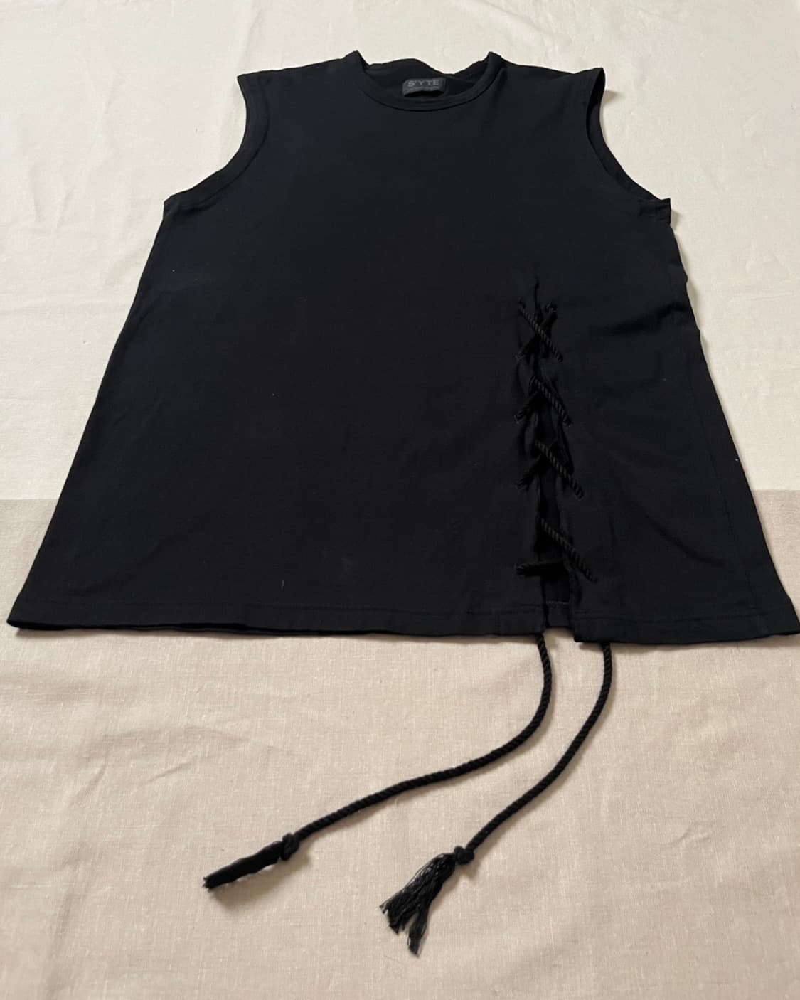 S’yte yohji yamamoto rope sleeveless 요지야마모토의 세컨드라인 s’yte 의 로프 슬리브리스 입니다. 흘러내리는 느낌의 면원단 제품으로 로프디테일리 포인트 되는 디자인 입니다. 표기사이즈 3의 루즈한 느낌으로 남성 프리사이즈 정도의 느낌 입니다. 사용감 외 별다른 하자 없는 좋은 상태 입니다. 가슴56 어깨48 총장80(뒷목점기준) 표기사이즈 3 model 170/63 계좌이체 거래시 무료배송 판매중인 대부분의 제품은 중고 제품으로 단순변심및 사이즈미스로 인한 교환 환불은 불가합니다. 사진과 상품설명으로 상태에 대해 최대한 설명을 드리나 사용 감이 있는 제품들이니 신중한 구매 부탁드립니다. 1~2cm의 실측 오차가 있을 수 있습니다