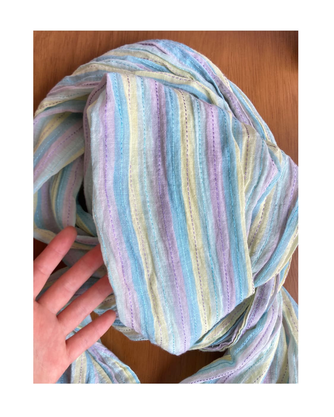 노랑, 분홍, 하늘, 연하늘 파스텔톤으로 몽글몽글해지는 색감이에요. 중간에 있는 스티치도 정말 예뻐요 ◌ 。˚✩ 따로 라벨은 없지만 아사면 느낌 소재 실측: 주름 있는 채로 폭42, 길이 182
