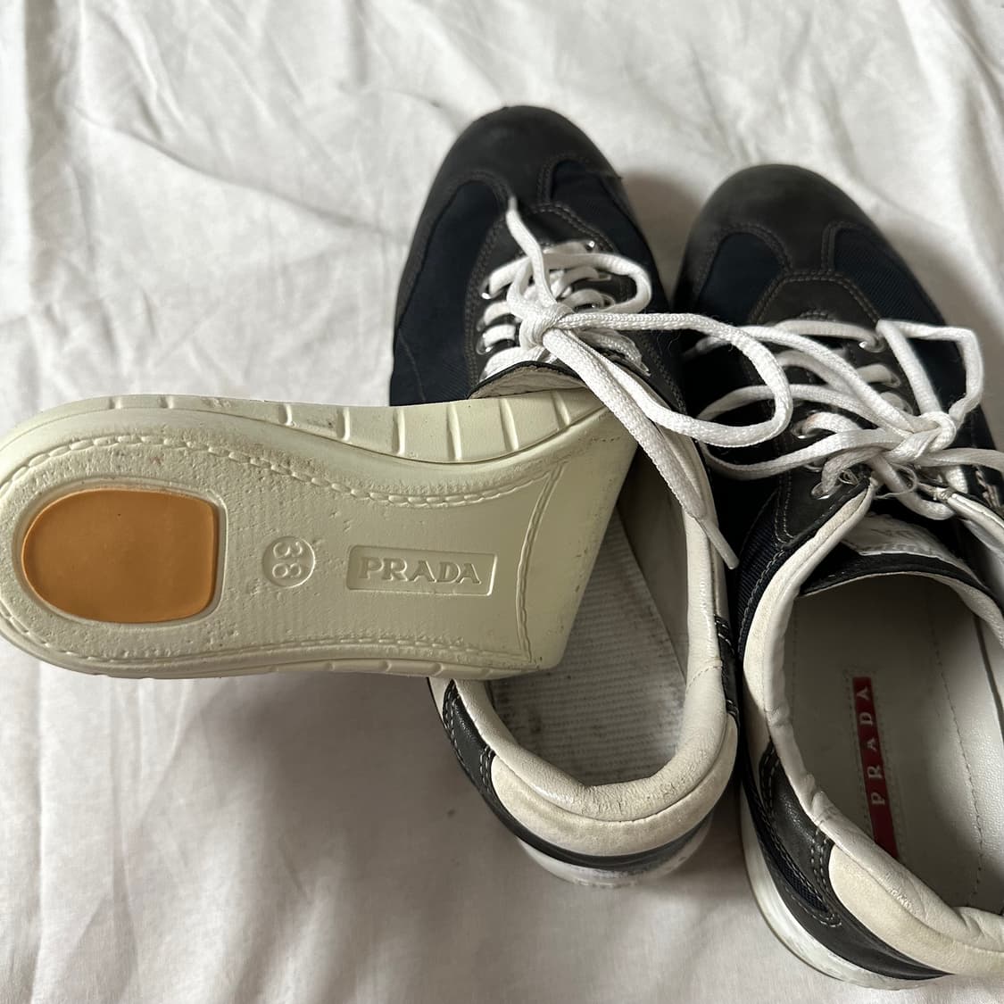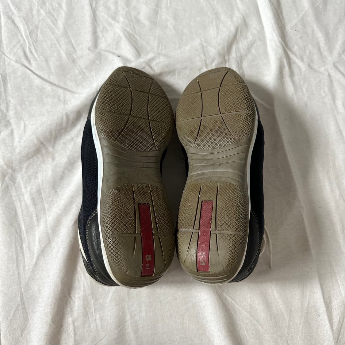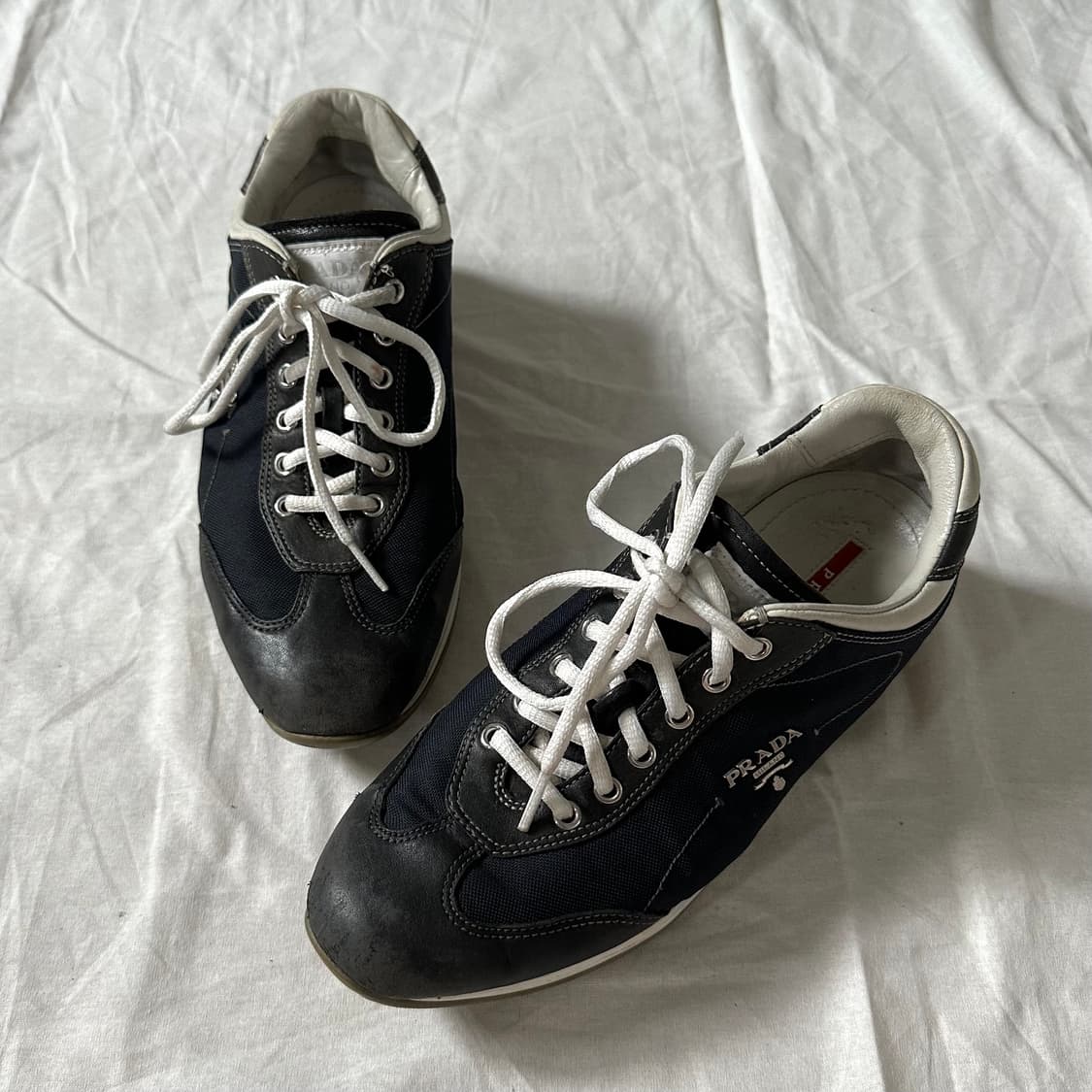 정품 빈티지 프라다 스포츠 라인의 아이코닉 스니커즈입니다. 클래식한 네이비 & 화이트 컬러 조합에 측면 메탈 로고, 내부 레드탭, 아웃솔 음각 로고 등 정식 디테일이 모두 살아 있는 정품 제품이에요. • 사이즈: EU 38 (245 추천) • 소재: 나일론 + 레더 콤비 • 상태: 전체적으로 자연스러운 사용감 있으며, 착화감 좋은 상태 유지 중 • 구성: 본품만 2000년대 프라다 특유의 미니멀 스포츠 무드를 담은 디자인으로, 꾸안꾸 스타일이나 아카이브 무드 좋아하시는 분들께 추천드려요!