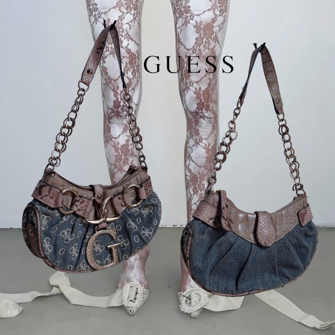 Vintage GUESS y2k pink phyton crystal chain Denim Bag in B condition 가로 23 세로 14 GUESS의 y2k 핑크 파이톤 데님 백 크리스탈 로고 버클 링 체인 디테일 ꦿ᭄구매는 채팅으로 문의주세요