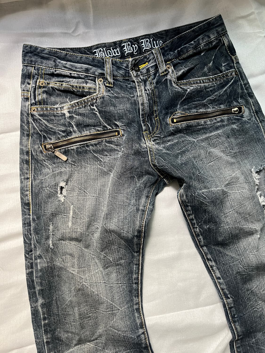 Zipper detail crushed denim pants Price: 6.8 허리단면: 40.5 밑위: 27 허벅지: 29 총장: 104 밑단: 21 (cm)