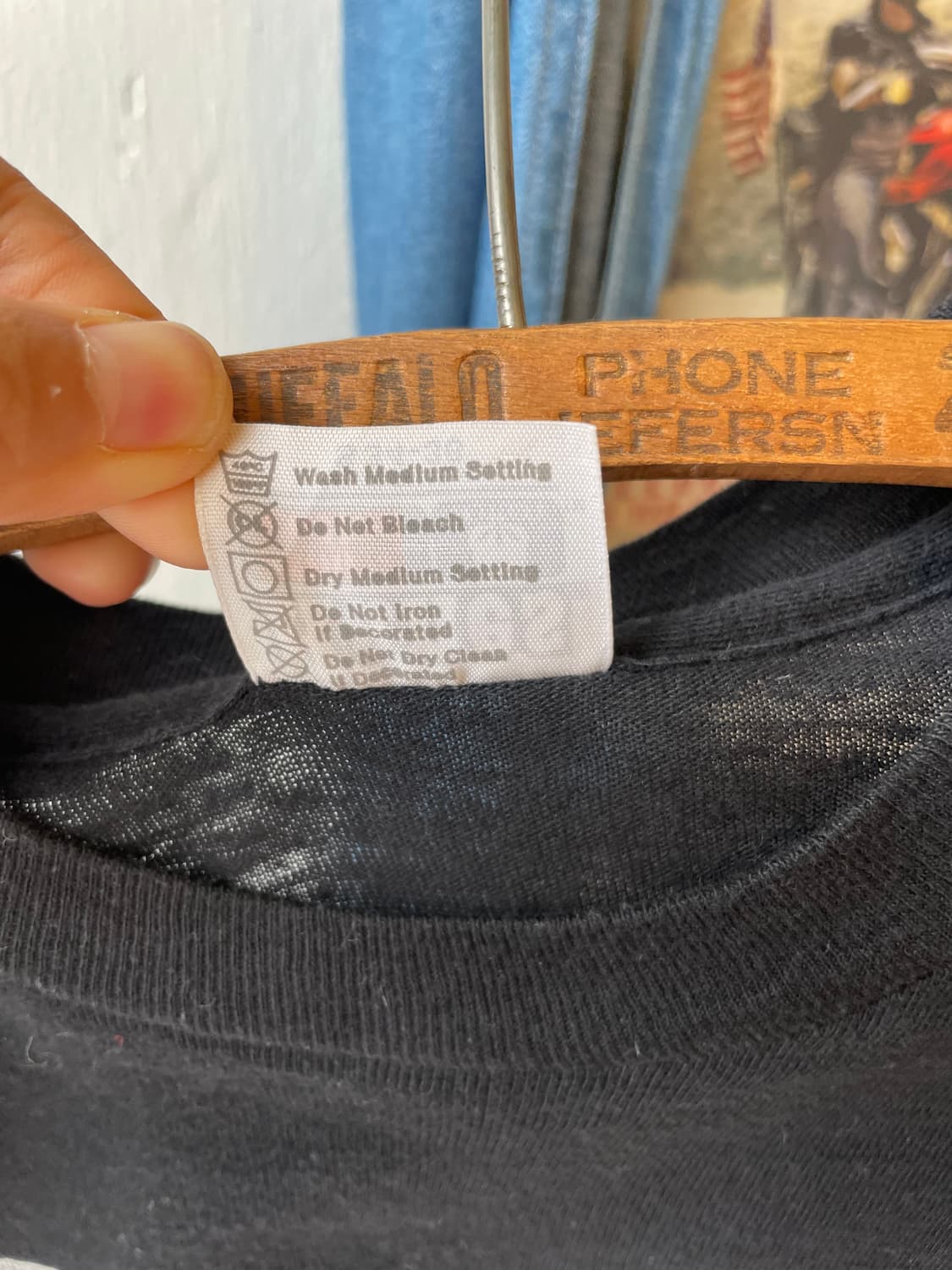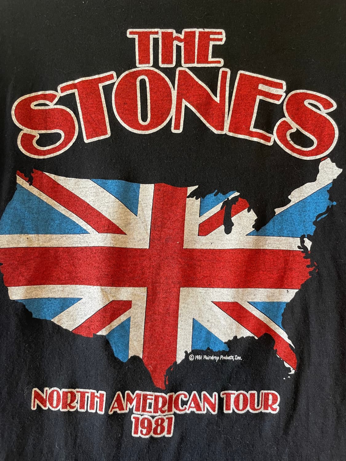 The Rolling Stones 1981 North American Tour Vintage T-shirt Made In U.S.A 전설적인 록밴드 The Rolling Stones의 1981년 북미 투어 오리지널 빈티지 티셔츠입니다. 미국 헤인즈사 Hanes의 싱글스티치 100% 코튼 바디 위에 앞면엔 아이코닉한 입술+혀 로고에 성조기, 뒷면엔 미국 지도 위 유니언잭과 ‘NORTH AMERICAN TOUR 1981’이 큼직하게 들어간 완벽한 투어 티셔츠 디자인. ©1981 Raindrop Products Inc. 프린트 표기까지 명확하게 확인되며, 빈티지 수집가나 록 밴드 팬들에게 귀한 아카이브입니다. 40여 년 세월이 흐른 지금, 자연스러운 페이딩과 빈티지 특유의 감성이 완벽히 살아있습니다. 프린트 색감도 선명하며 보풀이나 구멍 없이 매우 좋은 컨디션입니다. -size 표기 S 34-36 실측(cm) 어깨 38 가슴 41 팔 15 총장 60 #빈티지티셔츠 #밴드티 #빈티지밴드티 #롤링스톤즈