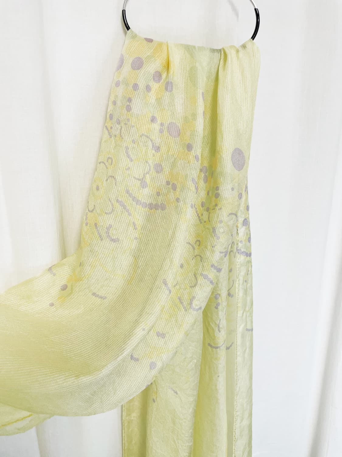 Sheer Print Scarf - Yellow 얇고 가벼운 시어 소재의 옐로우 스카프입니다. 은은한 패턴과 부드럽게 흐르는 질감이 조화를 이루며 착용했을 때 자연스럽게 연출됩니다. 가볍게 둘러주는 것만으로도 분위기를 더해주는 아이템입니다. ⊹ Condition. 9/10 길이 162 너비 52 마호리의 모든 제품은 세탁 후 꼼꼼히 검수하여 발송됩니다.