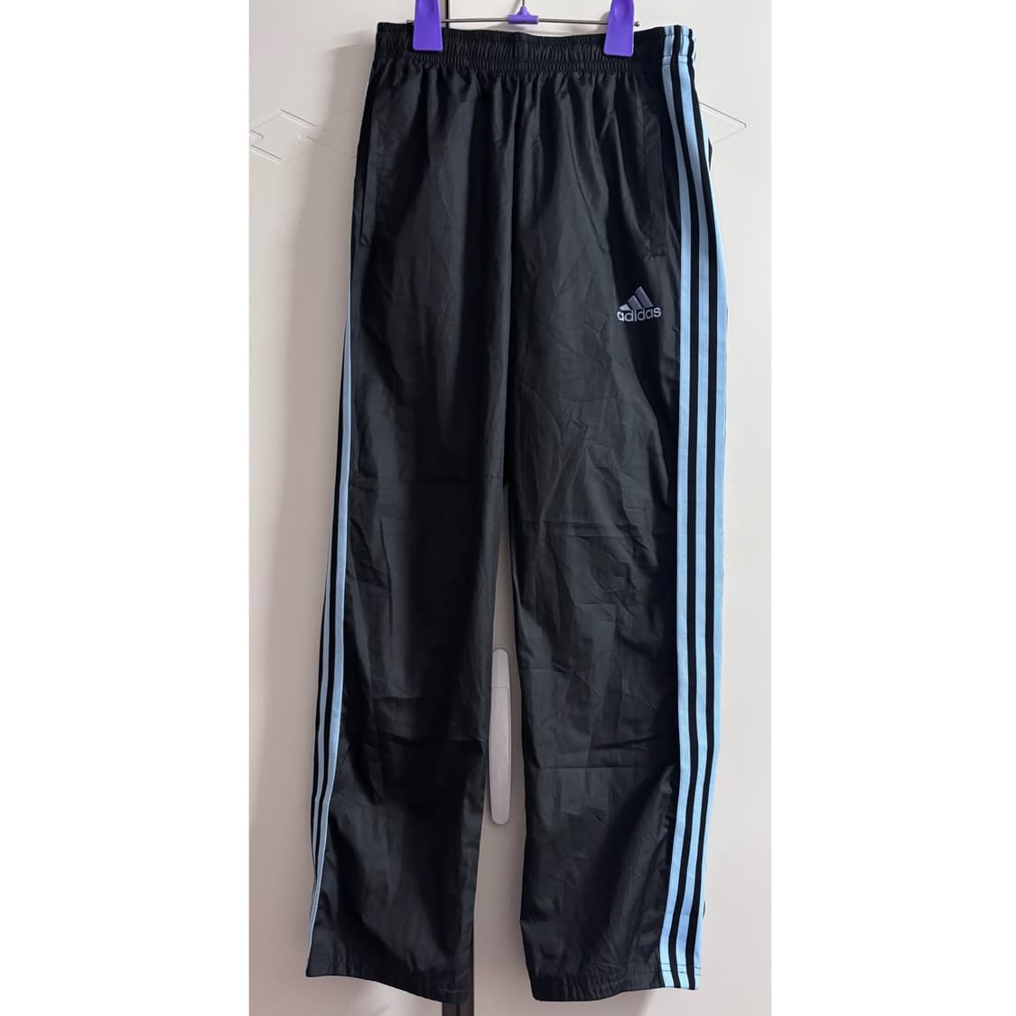 허리밴딩, 기장: 약 100cm, 허벅지단면: 약 34cm 블랙 색상에 하늘색 삼선 들어간 바스락 팬츠입니다 자수로고이고, 밑단 지퍼 디테일 있어요