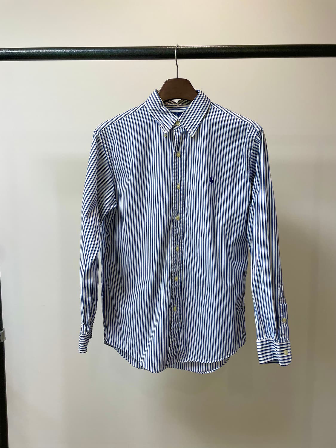 시원한 컬러감과 버튼 다운 양식, 은은한 퍼플 스트라이프 패턴이 매력적인 폴로 랄프로렌 커스텀핏 스트라이프 셔츠입니다. 표기 사이즈는 41-84 사이즈로 실측은 - 총장 77cm (카라제외) - 가슴 57cm - 어깨 48cm - 팔 60cm 입니다.