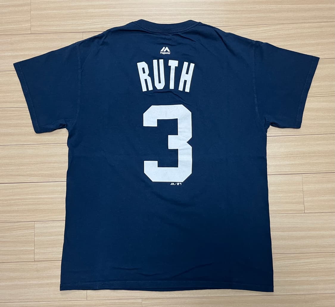 majestic New York Yankees Babe Ruth mlb 1/2 shirt medium navy 마제스틱 뉴욕 양키스 베이브 루스 MLB 야구 반팔 티셔츠 저지 미디움 네이비 마제스틱 정품이고, 어느 정도 사용감 있습니다. 사진과 동일한 상태로 보관 중 입니다. 메이저리그 뉴욕 양키스 베이브 루스 등번호 3번 프린팅된 제품입니다. 표기 사이즈는 M사이즈로 95정도 됩니다. 사이즈 참고가능하도록 실측 같이 올립니다. <실측> 가슴: 50.5cm 어깨: 46cm 소매: 17cm 총기장: 67cm 포장 꼼꼼히 해서 보내드립니다. 택포 25,000원입니다.
