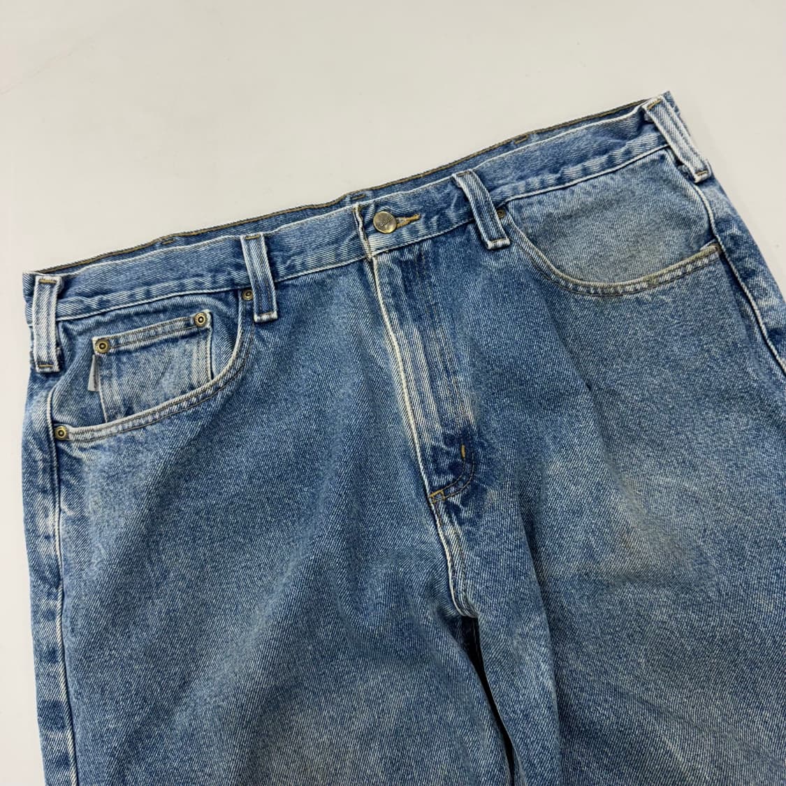 칼하트 OG 가죽패치 와이드 워크 데님팬츠 [Price] 65,000 [Size] 38 X 32 총장 107 허리 48 허벅지 35 밑위 32 밑단 23 📦 택배비 +3,800원 / 제주도&산간지역 +7,000원 📌 모든 제품은 선입금(선결제) 순 📌 교환 ❌ 환불❌ 사이즈미스/단순변심/생활감(빈티지특성) 등 ‼️ 빈티지 특성상 약간의 생활감, 미세오염, 물빠짐 등이 있을 수 있습니다. 제가 항상 하자가 있는 부분은 먼저 항상 정직하게 말씀은 드리겠지만 혹시라도 발견못한 하자가 있을 수 있으니 예민하신 분들은 한번 더 생각하고 구매해주시면 감사하겠습니다.😣😣