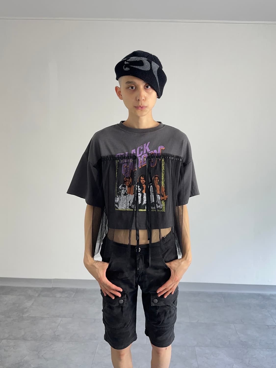 흐릿하게 비치는 밴드 티의 형상, 흩날리는 매듭과 크롭 핏. 여러분의 여름을 보다 시크하고 매력적인 나날로 만들어 줄 티셔츠입니다. - 일본 생산품 - 오버 실루엣 - 크롭 핏 - 밴드 티셔츠 타입 프린팅 - 튤 레이어드 - 리본 매듭 L size 어깨 60 가슴 50 소매 18 암홀 23 총장 42 Condition : A