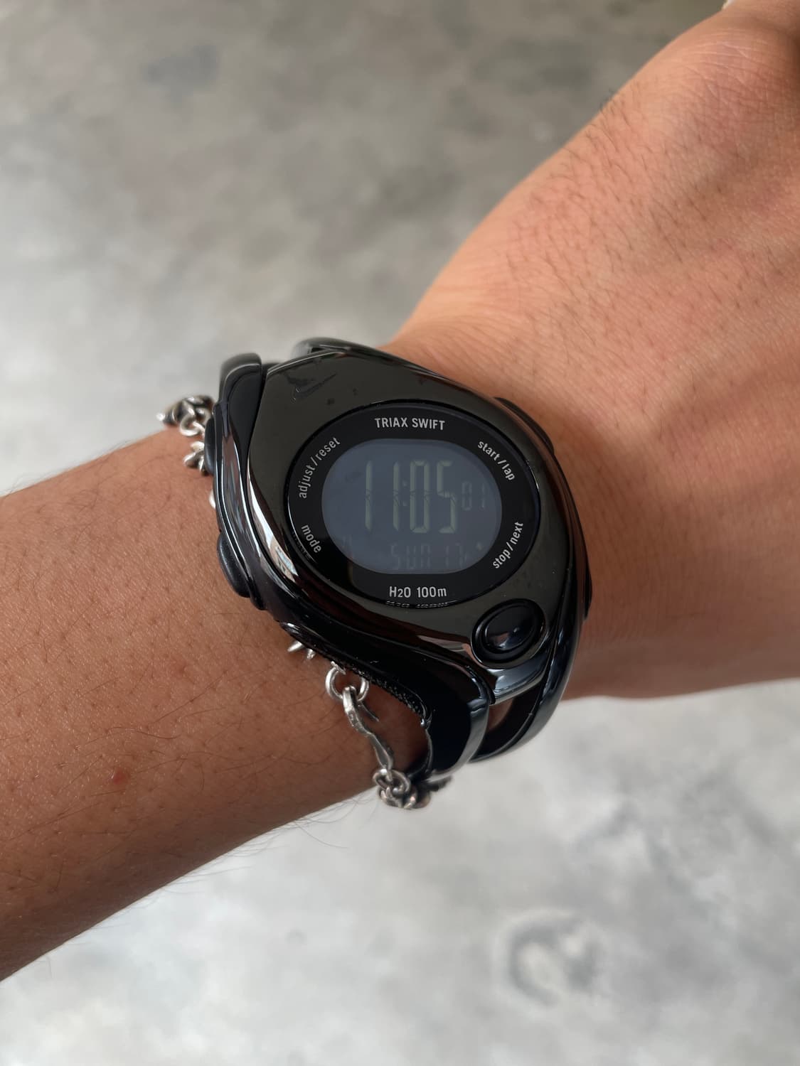 🔌 NIKE Triax Swift(WR0090) 2000년~ 2005년경까지 발매된 모델로, 특이하게 일반적인 트라이엑스 모델들과 달리 벤틸레이션의 극대화를 위해 밴드를 두 갈래로 만들었다. 블랙펄 컬러감의 보기 드문 유광의 블랙 베젤과 밴드의 조화가 상당히 매력적인 개체로 내가 말하고자 했던 촌스럽지만 촌스럽지만은 않은 아주 신선한 느낌의 시계. 여성용으로 나온 개체이지만, 남자인 나에게도 적당히 잘 맞고 밸런스가 나쁘지 않은 제품. • 주요 기능: 타이머, 크로노, 듀얼 알람, 데이터 모 드(랩 타임 저장), 백라이트, 100m 방수 _배터리 교체 완료. _약간의 사용감만 느껴지고 하자 없는 컨디션.