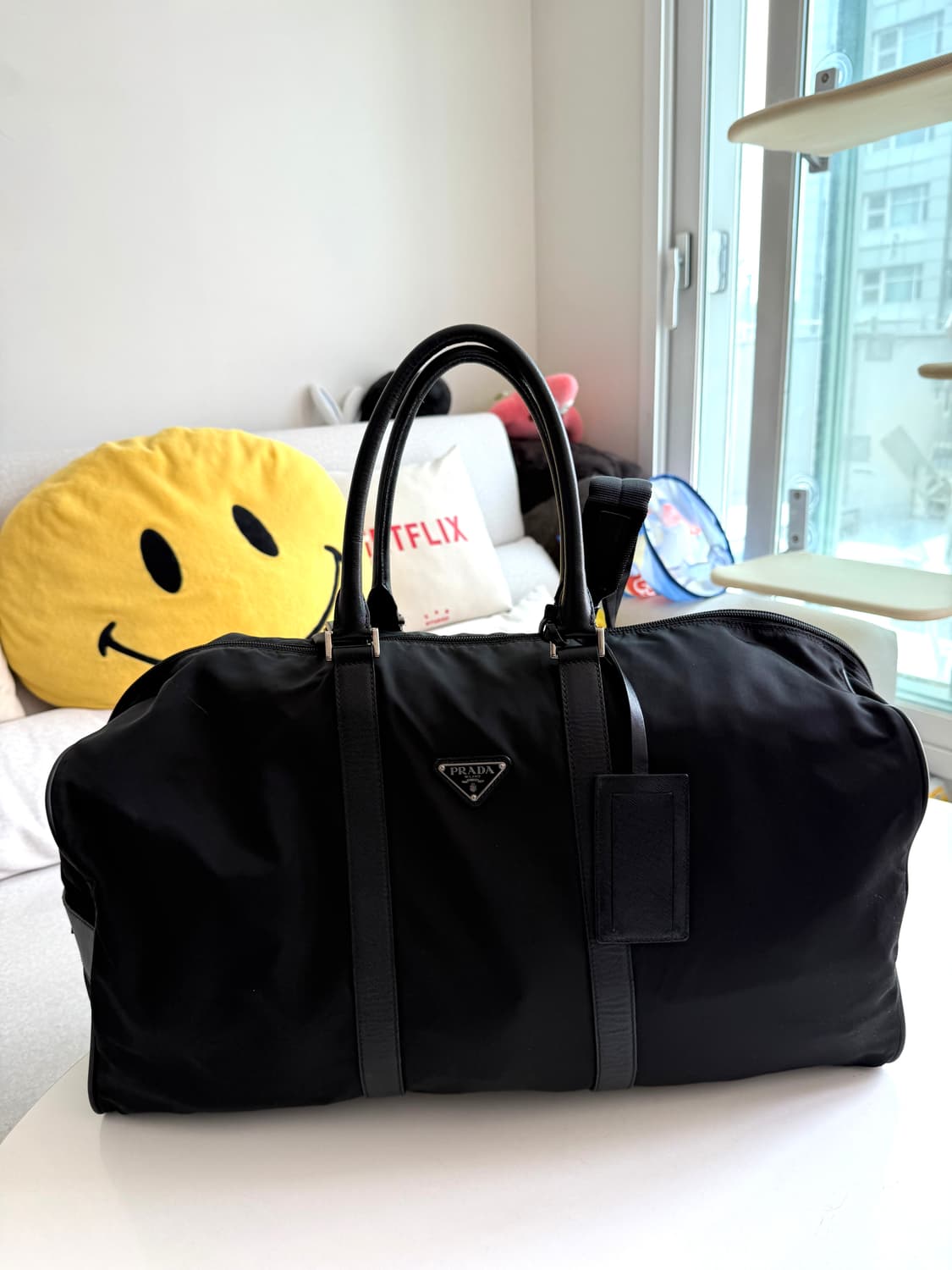 거래 방법 : 직거래 or 택배 상태 : 10/8.5 사이즈 : OS 거래 지역 : 9호선 등촌역 혹은 9호선 언주역 약간 중고로 구매해서 해외나갈때 두번정도 들었습니다! 상태도 상당히 좋고요 짱짱합니다. 항상 가죽으로 된 보스턴백을 사용했는데 무거워서 프라다는 개버딘 원단이라 가벼워서 굉장히 편하게 잘 사용했고요. 구매할 때 부터 구성품 없이 본품만 구매했습니다. 자물쇠 비밀 번호는 54입니다.
