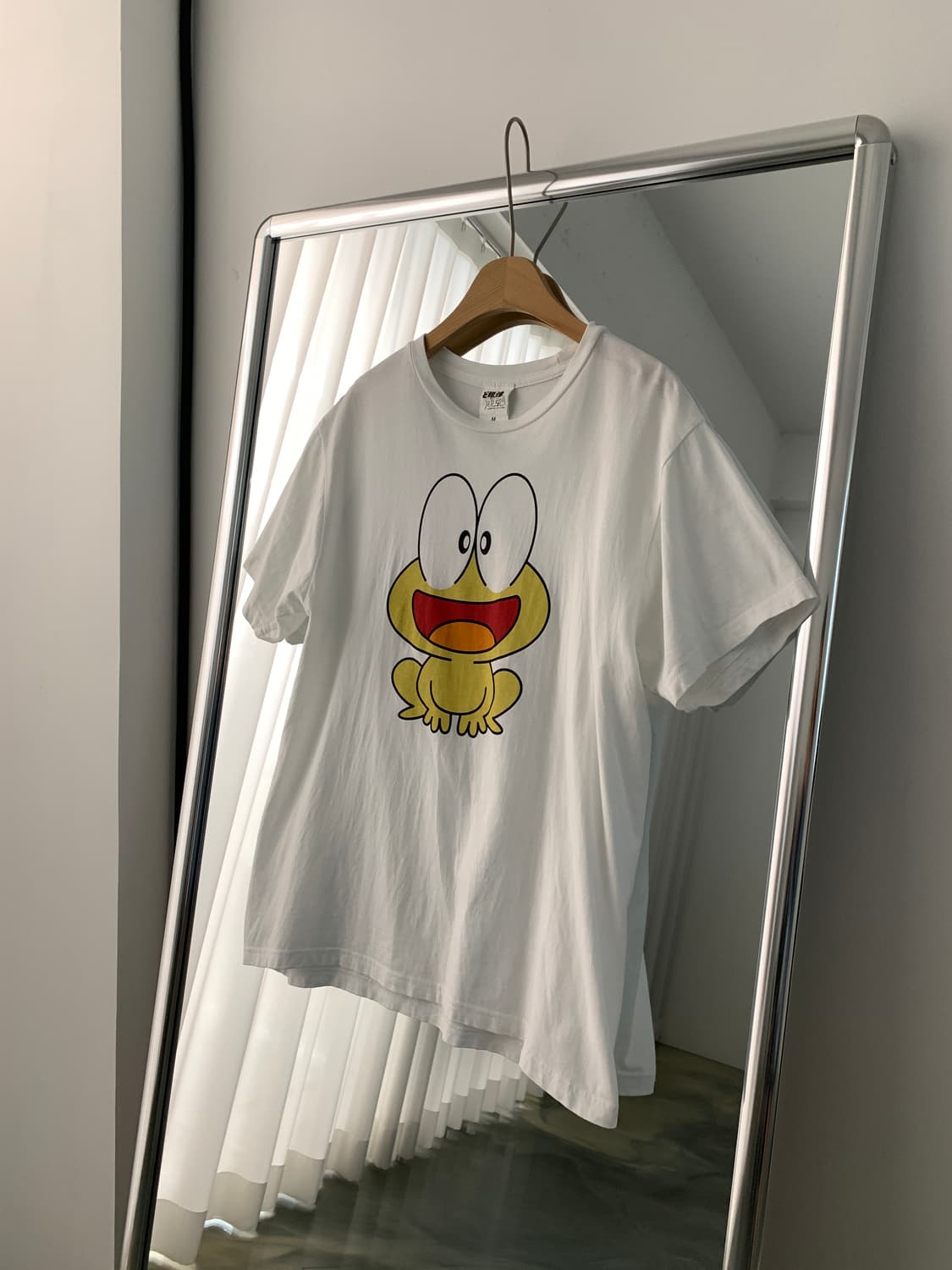 1970년대에 연재된 인기 개그 만화 도콘조 가에루(ど根性ガエル) 일명 왕 근성 개구리 한국에선 명랑 개구리 뽕키치로 불리우는 전설의 애니메이션으로도 유명한 명작입니다. 소년 히로시의 실수로 뿅키치라는 개구리가 T셔츠에 눌려서 붙어버리게 되고 이후 사람의 말을 할 수 있게 된 뿅키치와 히로시가 벌이는 여러 가지 해프닝을 다룹니다. 실사화 드라마에서 데스노트 L 역할로 유명한 마츠야마 켄이치가 입고 나온 티셔츠 디자인입니다. color : white size: M -총장 65/어깨 44.5/가슴 49/소매 19 *빈티지 특성상 예민하신 분들은 신중한 구매 부탁드립니다. *특수 세탁 후 보내드리고있어 바로 착용하셔도 됩니다. *구매 원하시는 분들은 안전 결제로 해주시면 됩니다.