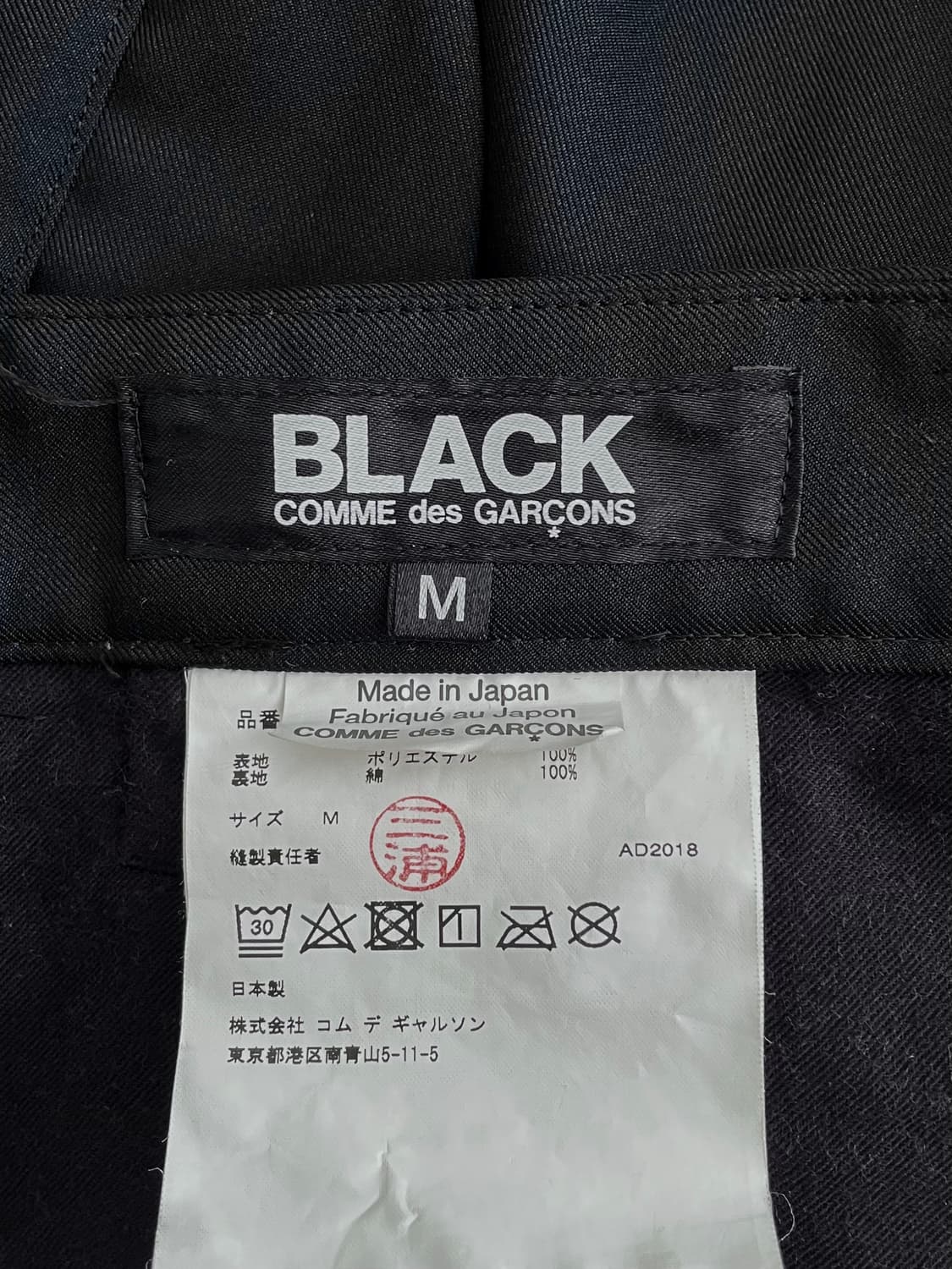 블랙 꼼데가르송 커팅 디자인이 들어간 팬츠입니다 원래의 자연스러운 주름이 있는 폴리 소재입니다 사용감 보이지 않는 깨끗한 상태입니다 M사이즈 허리39cm 밑위28cm 허벅지27cm 밑단18cm 기장98cm