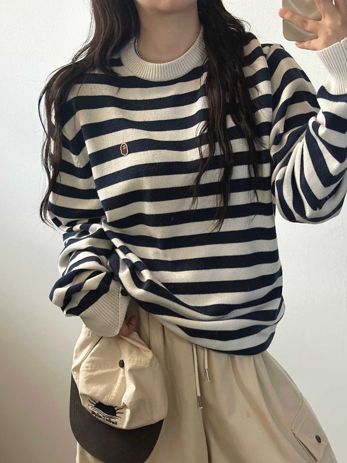 R-: 베이프 네이비 미니사루 스트라이프 니트 📎 160,000 📎 총장: 71 가슴: 58 어깨: 53 팔기장: 72(L) ( 측정위치 및 방법에 따라 1-3cm 오차가 발생할 수 있습니다. ) 📎 컨디션: 자연스러운 사용감있어요. ( 핸드폰 밝기를 최대로 늘려주셔야 실물과 가장 근접합니다.) 로로즈 유일매물 제품으로 확인되며 스트릿한 무드와 동시에 데일리하게 착용해 주기 좋은 베이직한 스트라이프 패턴과 미니 사루 로고 디자인으로 귀엽게 포인트가 되어주는 제품입니다. 울&아크릴 혼방 소재로 부드럽고 보온성이 좋은게 특징이며 루즈하게 떨어지는 실루엣이 예쁜 니트입니다.