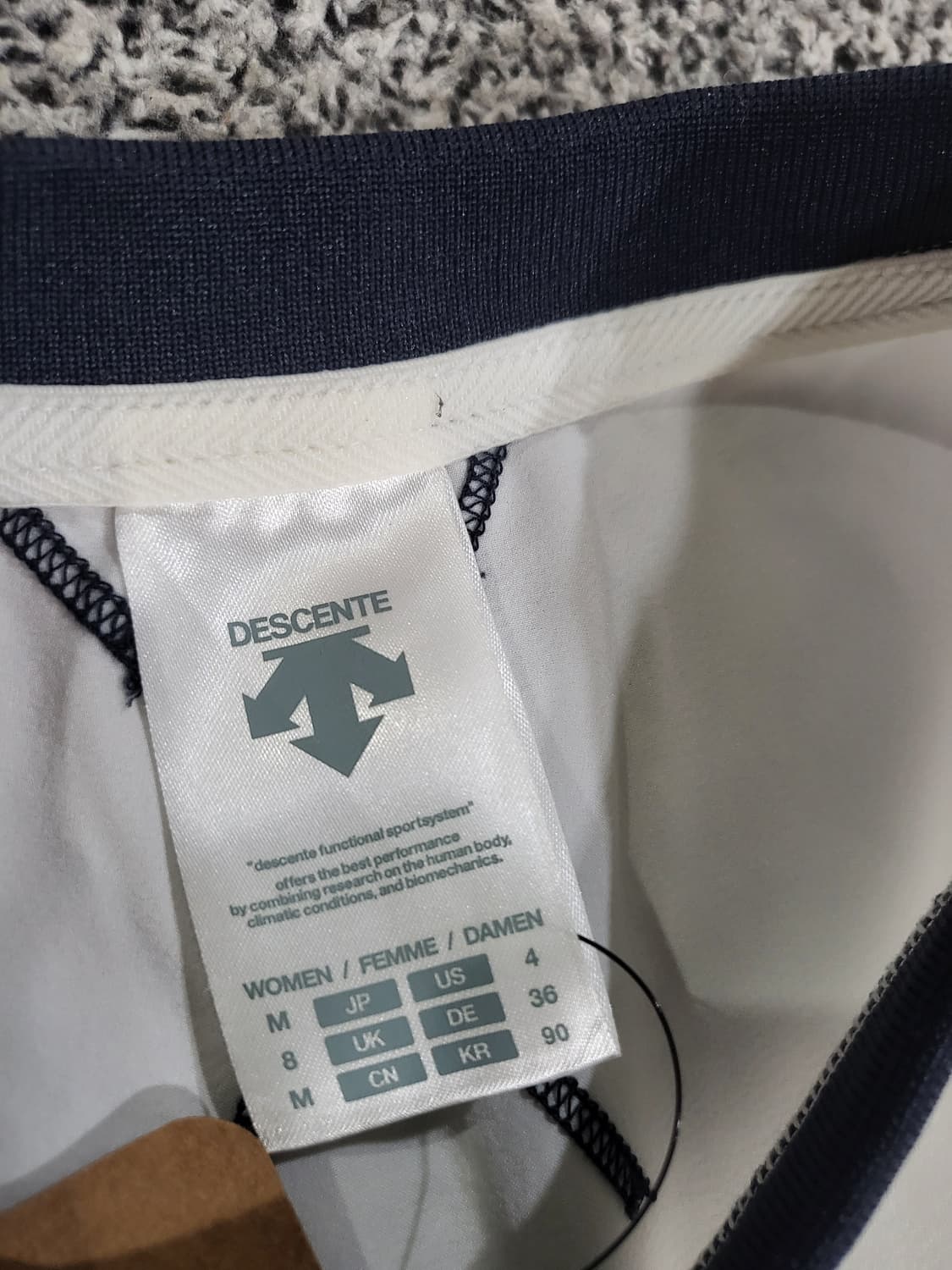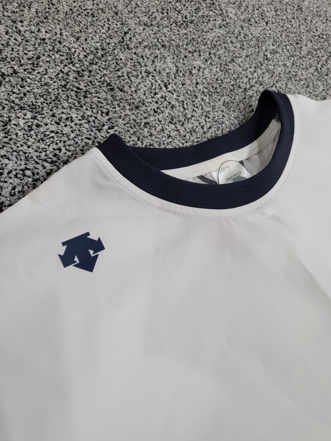 데쌍트 반팔 티셔츠 깔끔한 흰색 바탕에 네이비 컬러로 배색 처리된 넥 라인과 소매 끝이 포인트가 됩니다. 어깨 쪽 데쌍트 로고와 하단의 브랜드 마크도 절제된 느낌으로 잘 배치되어 있습니다. 심플하면서도 스포티한 무드를 살려 다양한 스타일링에 무난하게 어울릴 수 있는 디자인입니다. 특히 운동복과 일상복 사이의 경계에서 활용도 높게 입기 좋으실 것 같습니다.