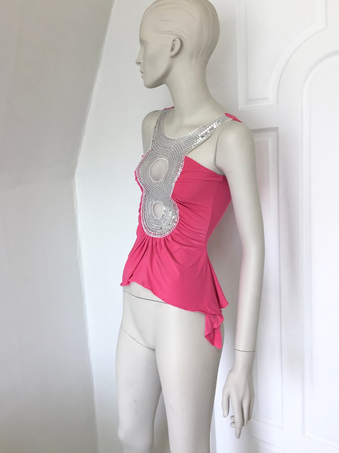 Double circle Spangle Drape Top 8만원이상 계좌거래시 배송비 무료 사이즈 : S 단면기준(cm) 가슴 : 30 총장 : 49 - Made in U.S.A - 실버톤의 스팽글 포인트 - 장식 중심으로 자연스럽게 드레이프지는 디자인 - 프릴형태로 떨어지는 밑단 - 신축성 좋음 - 일부분 스티치 끊김현상 있으나, 이외 매우좋은 컨디션