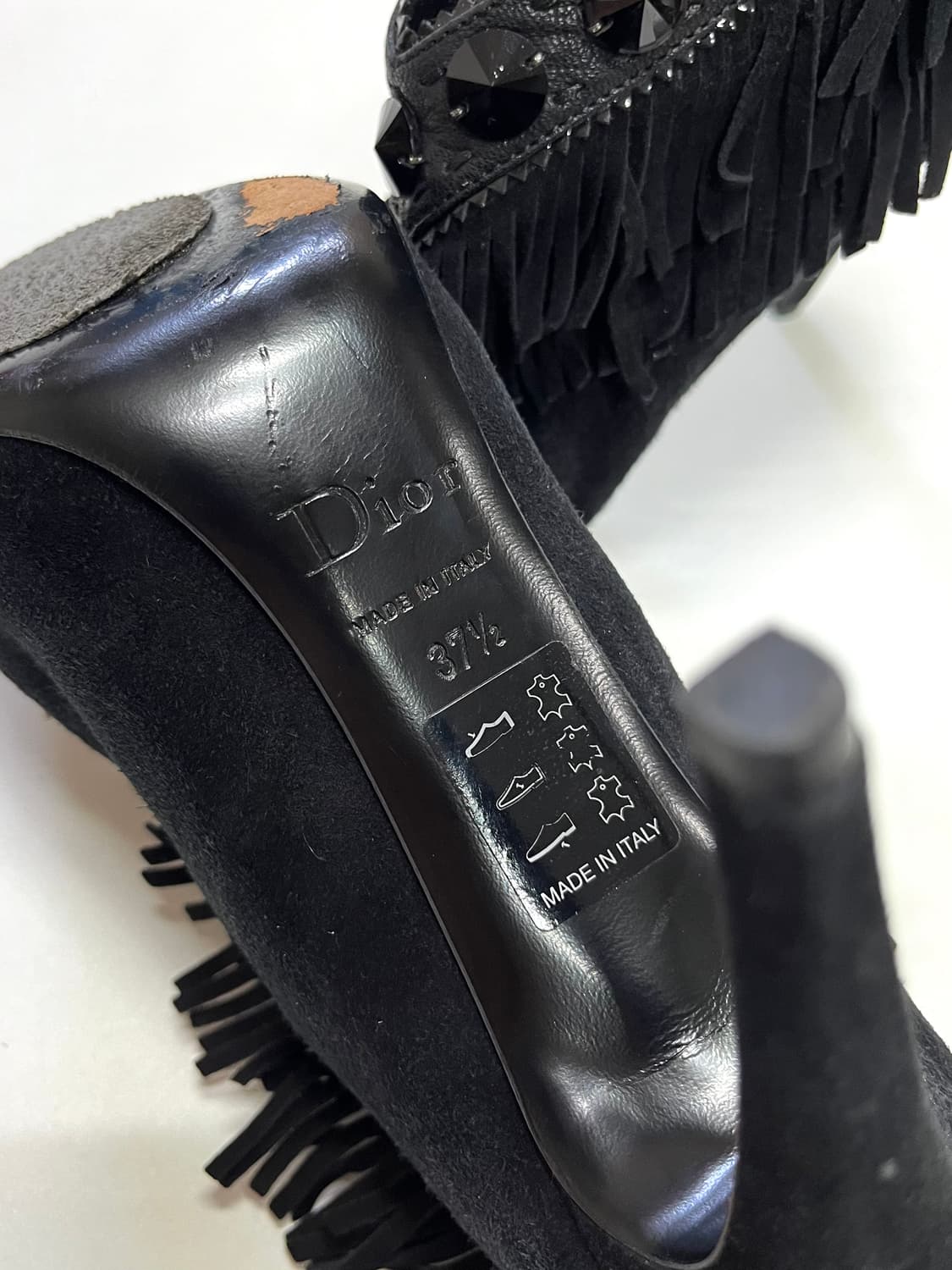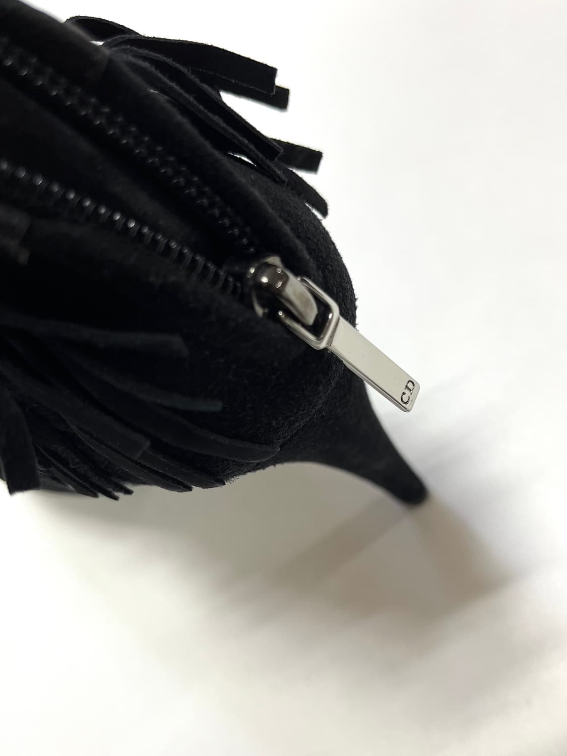 CHRISTIAN DIOR MADE IN ITALY YKK ZIPPER 스웨이드로 제작된 프린지 디테일이 매력적인 크리스찬 디올의 런웨이로 발매된 앵클 부츠 제품 입니다 전체적인 쉐잎과 프린지 장식의 조화가 고급스러운 제품으로, 착용 실루엣이 매력적입니다 size: 37 1/2 (240-245) condition: 9/10 (오염 및 결함 없는 상태의 제품)