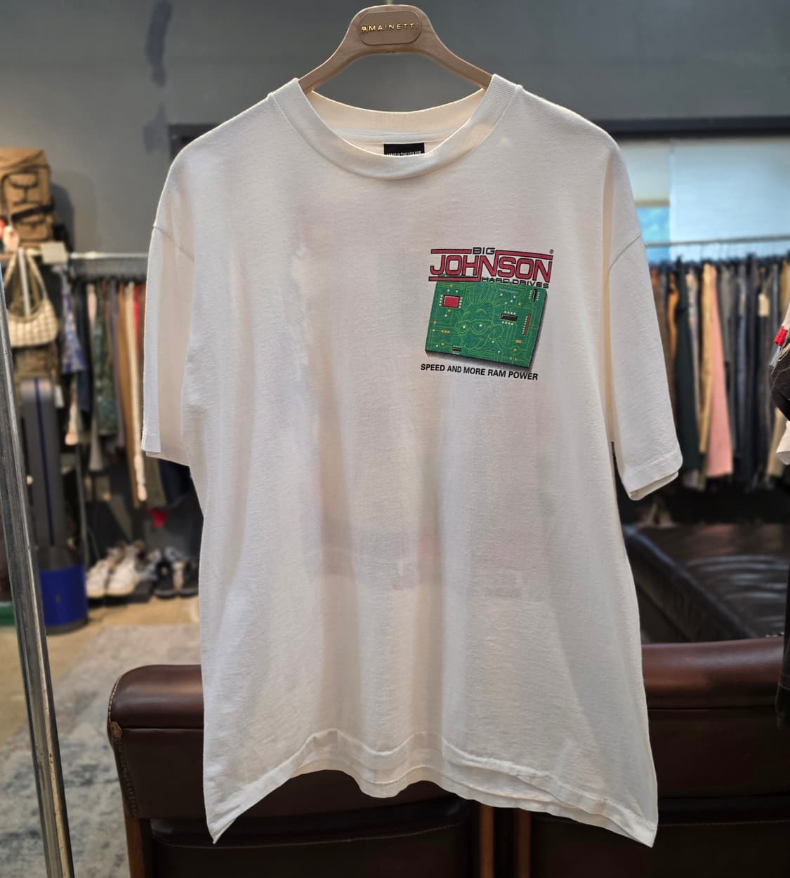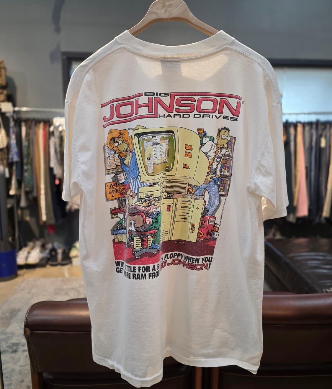 Big Johnson™ by ONEITA 프린트 전면: "Hard Drives" 테마 / 후면: 컴퓨터 유머 그래픽 + 성적 이중의미 Made in USA / ONEITA / 100% COTTON / PRE-SHRUNK 생산연도 1990년대 중반~후반 추정 사이즈 L / 100~103정도 가슴단면 55cm 어깨단면 51cm 총장 65.5cm