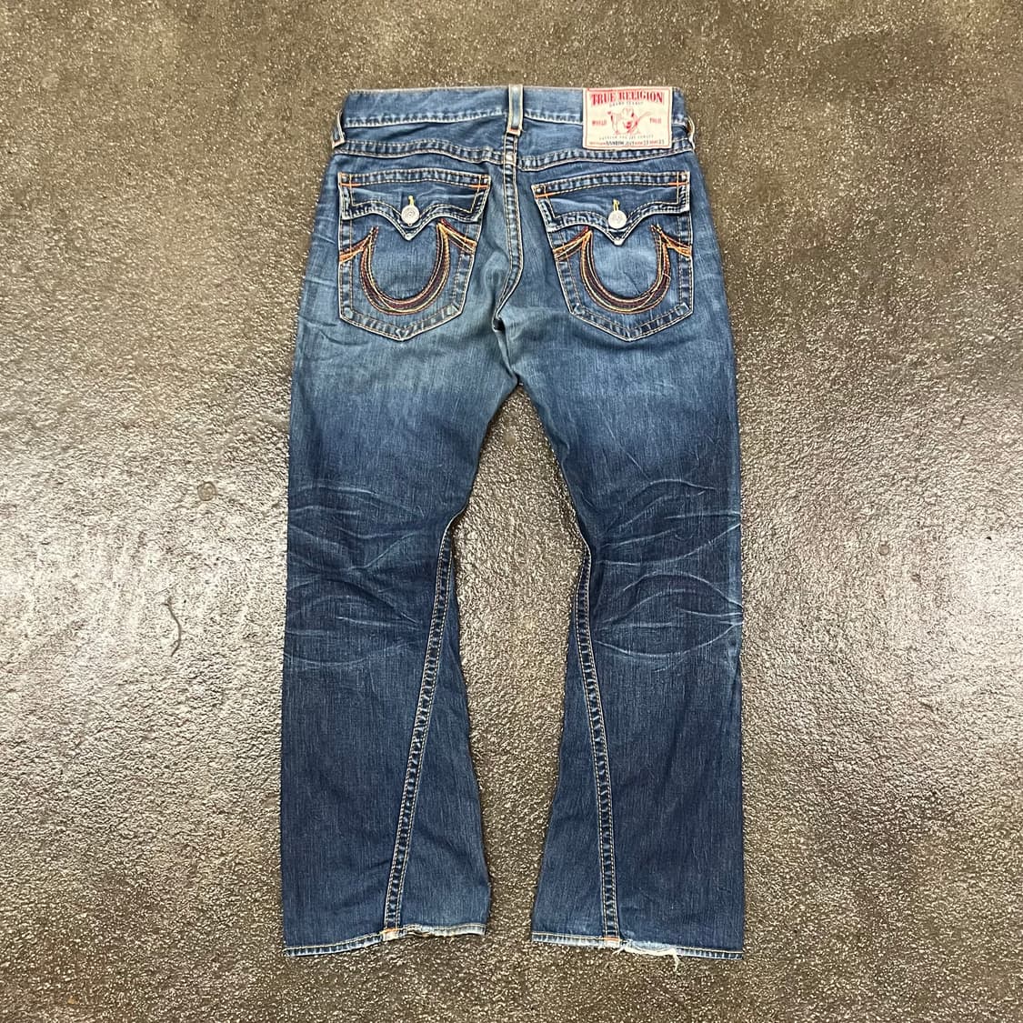 27.5cm 넓은 밑단 플레어와 굵은 레인보우 스티치 디자인이 특징인 트루릴리젼 레인보우 조이 부츠컷입니다. 데미지 (사진)는 착용에 지장 없습니다🫡 표기(실측): 33“ (34”) 실측: 허리44 허벅34 총장114 밑단27.5