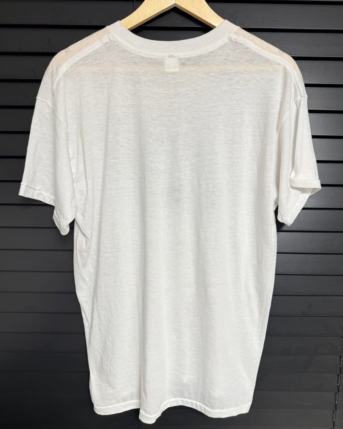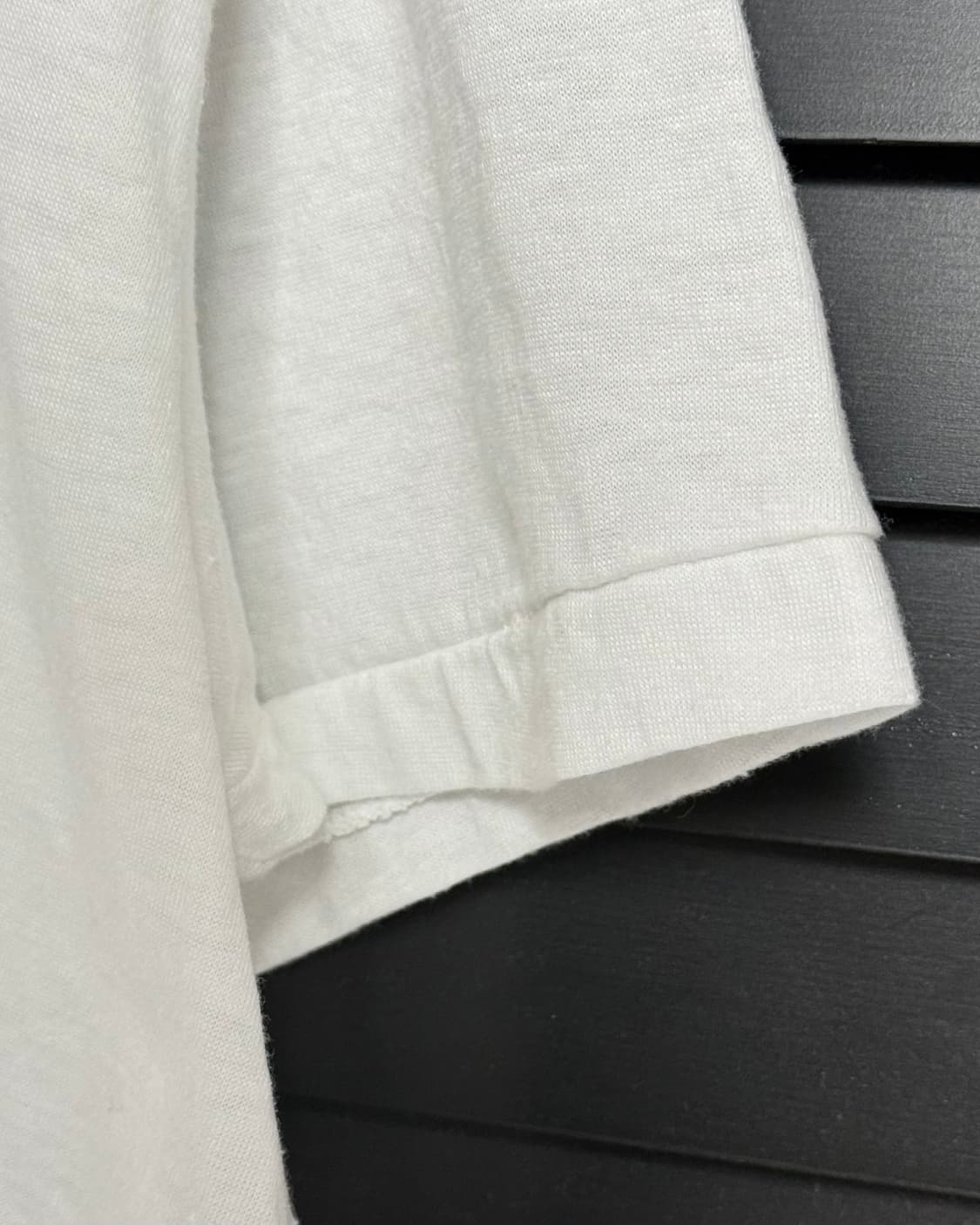 ESKO ALL-CLASS REUNION ’76 빈티지 티셔츠 MAYO SPRUCE / 화이트 1976년 에스코 지역 동문회(ALL-CLASS REUNION)를 기념해 제작된 빈티지 그래픽 티셔츠로, 프론트 중앙에 아이코닉한 이글루(igloo) 일러스트와 ESKO ALL-CLASS REUNION ’76 레터링이 네이비 컬러 프린트로 디자인되어 있습니다. MAYO SPRUCE 브랜드의 50% 코튼 / 50% 폴리에스터 혼방 바디로, 특유의 소프트하면서 드라이한 빈티지 트라이블렌드 느낌이 잘 살아있습니다. 목택은 MAYO SPRUCE 레트로 라벨이 부착되어 있으며, 사이즈 표기는 X-LARGE (46-48)입니다. 슬리브와 밑단은 오리지널 싱글 스티치 마감으로 70년대 특유의 빈티지 티셔츠 디테일을 보여줍니다. 얇고 가벼운 폴리 혼방 원단 특성상 살짝 비침이 있으며, 자연스러운 에이징과 워싱감이 매력적인 상태입니다. 백 프린트는 없는 단면 디자인으로, 올드 스쿨 빈티지 프린트의 간결한 멋이 살아 있습니다. MAYO SPRUCE는 mid-century (1950s~1970s) 미국의 대표적인 언더웨어/티셔츠 브랜드 중 하나로, HANES나 FRUIT OF THE LOOM과 함께 당시 스탠다드 빈티지 티셔츠 라벨로 인정받았습니다. SPRUCES의 50/50 혼방 제품은 특히 1970s 빈티지 시장에서 높은 수요를 자랑하며, 현재도 일본과 미국의 빈티지 마켓에서 컬렉터 아이템으로 취급됩니다. 사이즈 XL 어깨 50CM 가슴 50CM 총장 69CM 팔 16.5CM 빈티지 제품 특성상 교환 환불은 불가합니다. 미처 발견하지 못한 오염이 있을수 있으며 데미지 및 오염에 민감하신 고객님들께서는 신중히 고민후 구매해주시길 바랍니다! 제품의 실측이 1~3CM 정도의 오차가 발생할 수 있습니다. 궁금하신 점 편하게 메세지 주세요. 감사합니다!